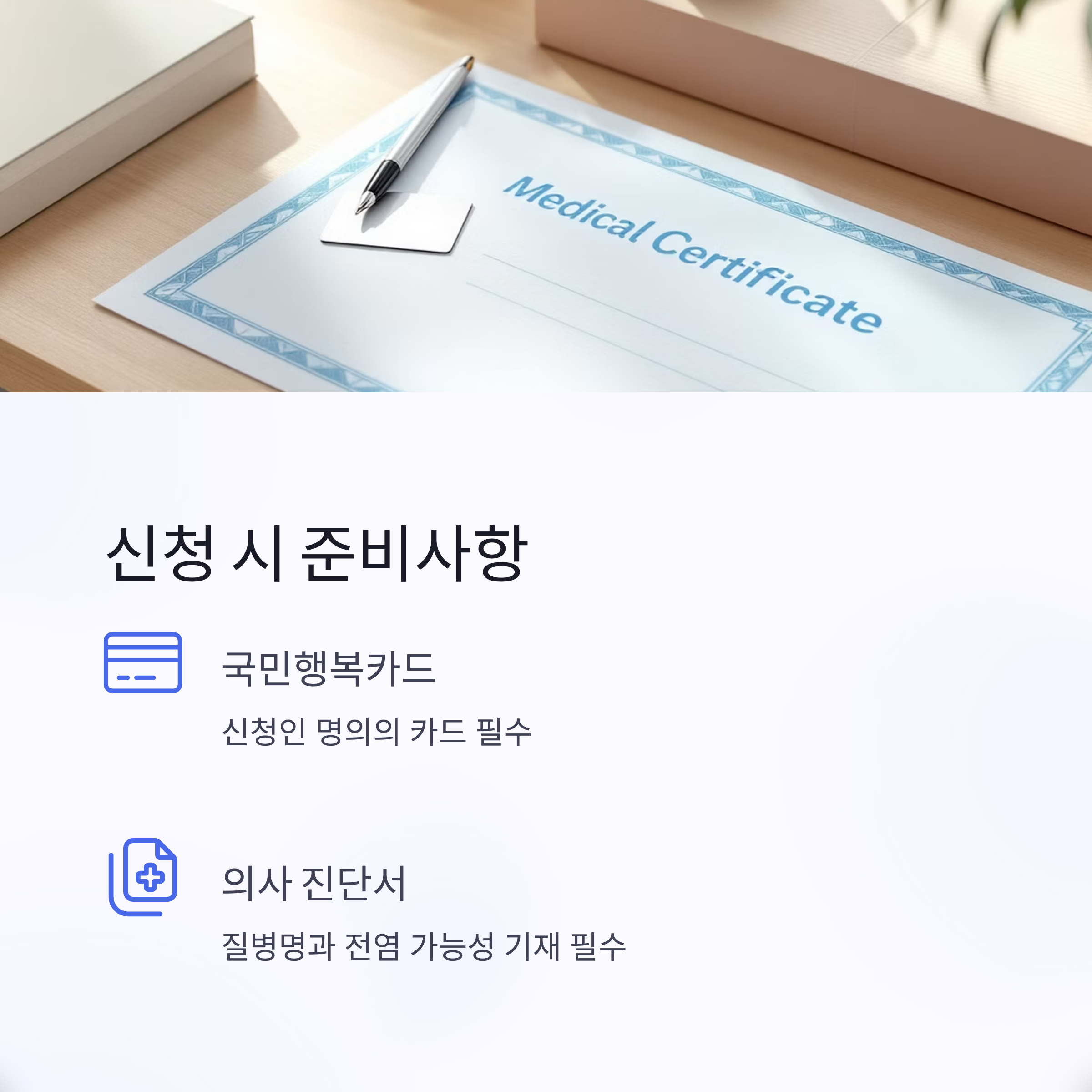- 의사 진단서 또는 소견서 (질병명과 전염 가능성 기재 필수)