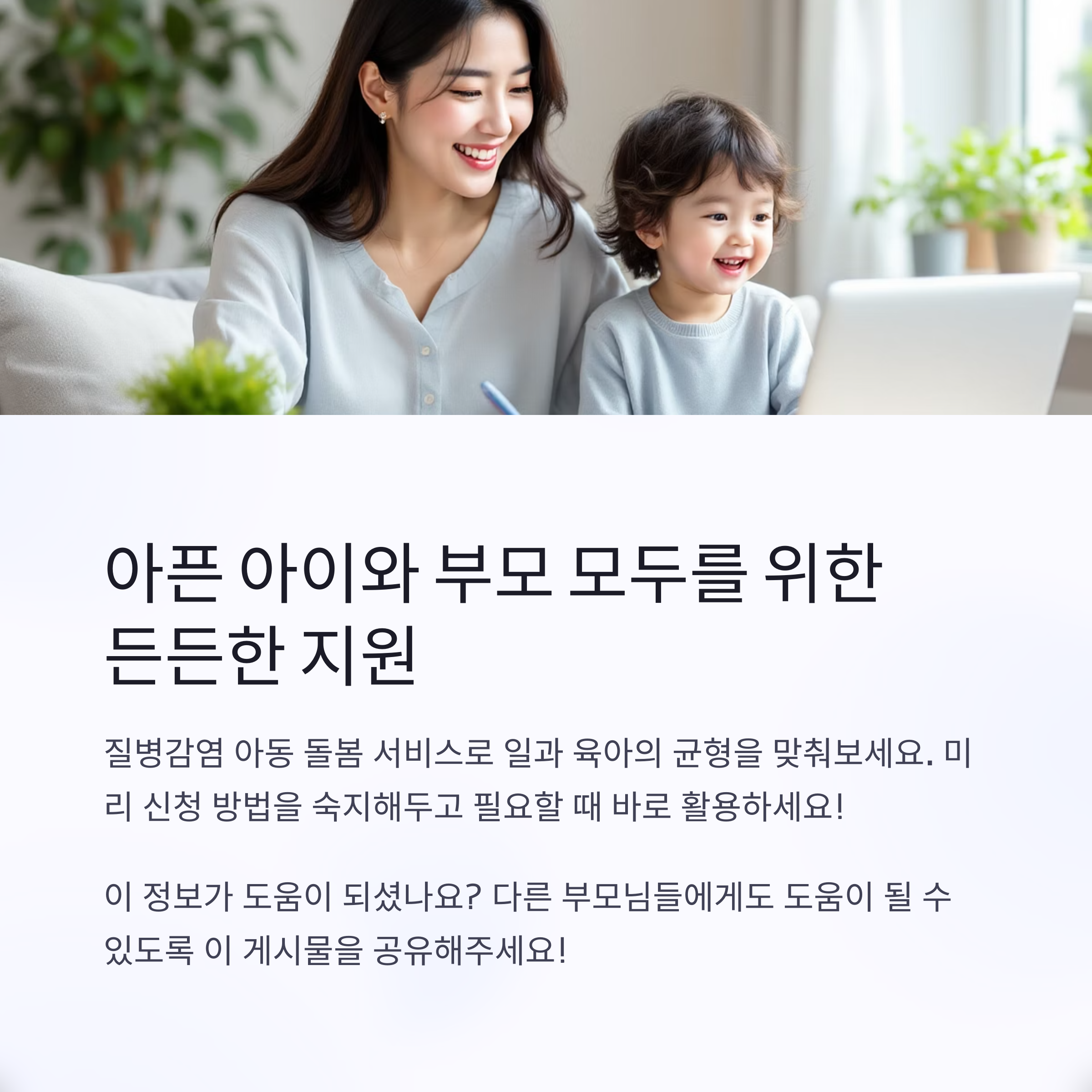 질병감염 아동 돌봄 서비스는 아픈 아이와 맞벌이 부모 모두를 위한 든든한 지원책입니다. 미리 신청 방법을 숙지해두시고, 필요한 순간에 적극 활용하여 일과 육아의 균형을 잘 맞춰나가시기 바랍니다.