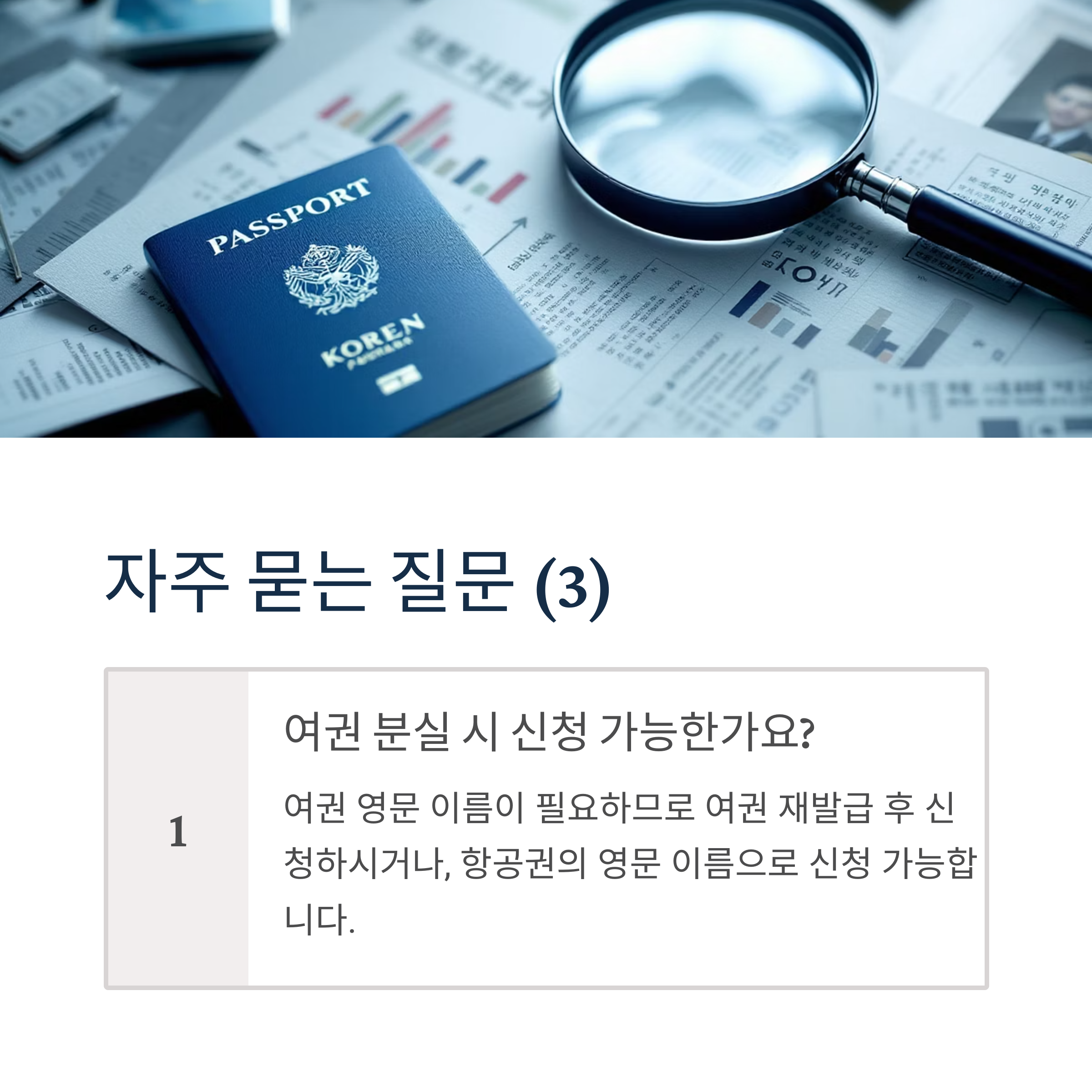A: 여권 영문 이름이 필요하므로 여권 재발급 후 신청하시거나, 항공권의 영문 이름으로 신청 가능합니다.