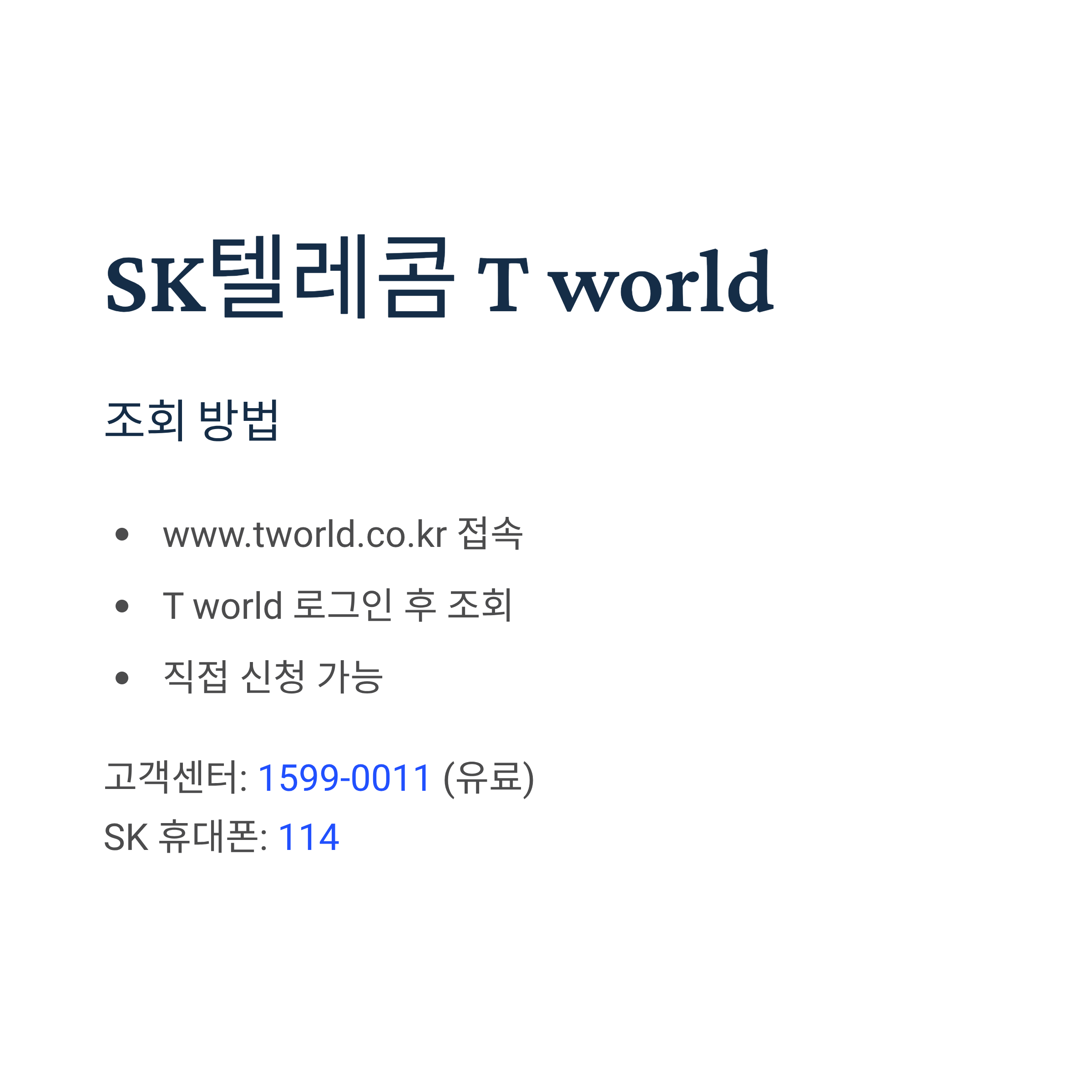 고객센터: 1599-0011 (유료) / 114 (SK 휴대폰)