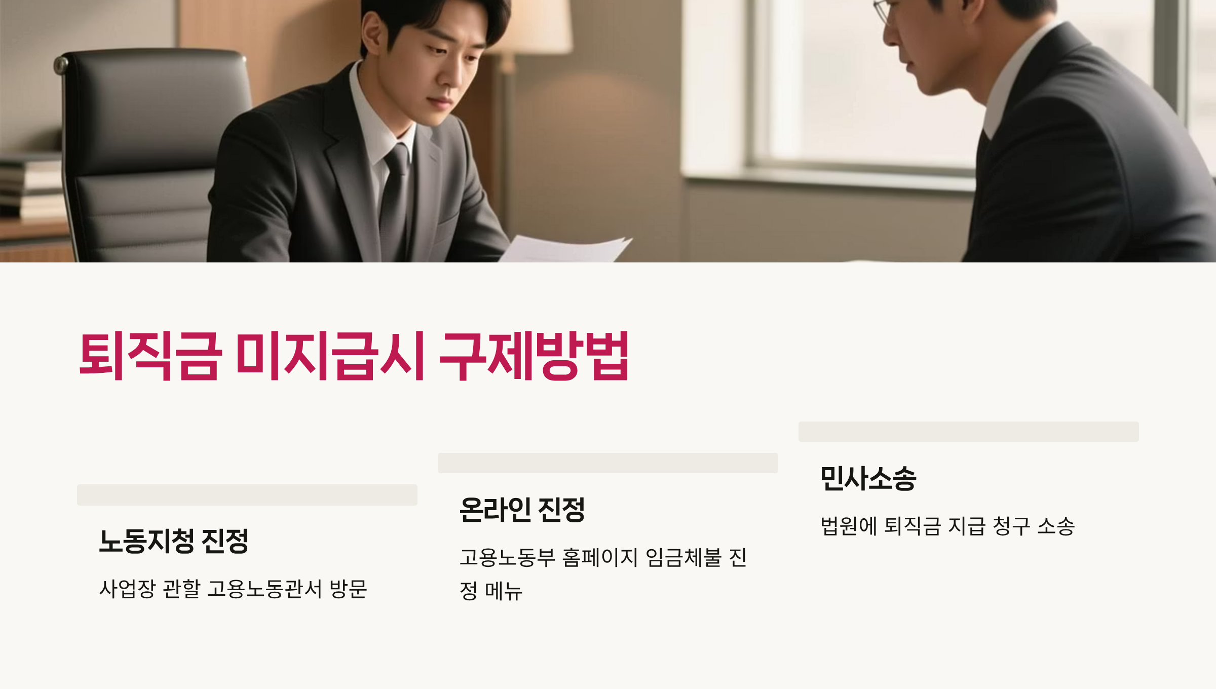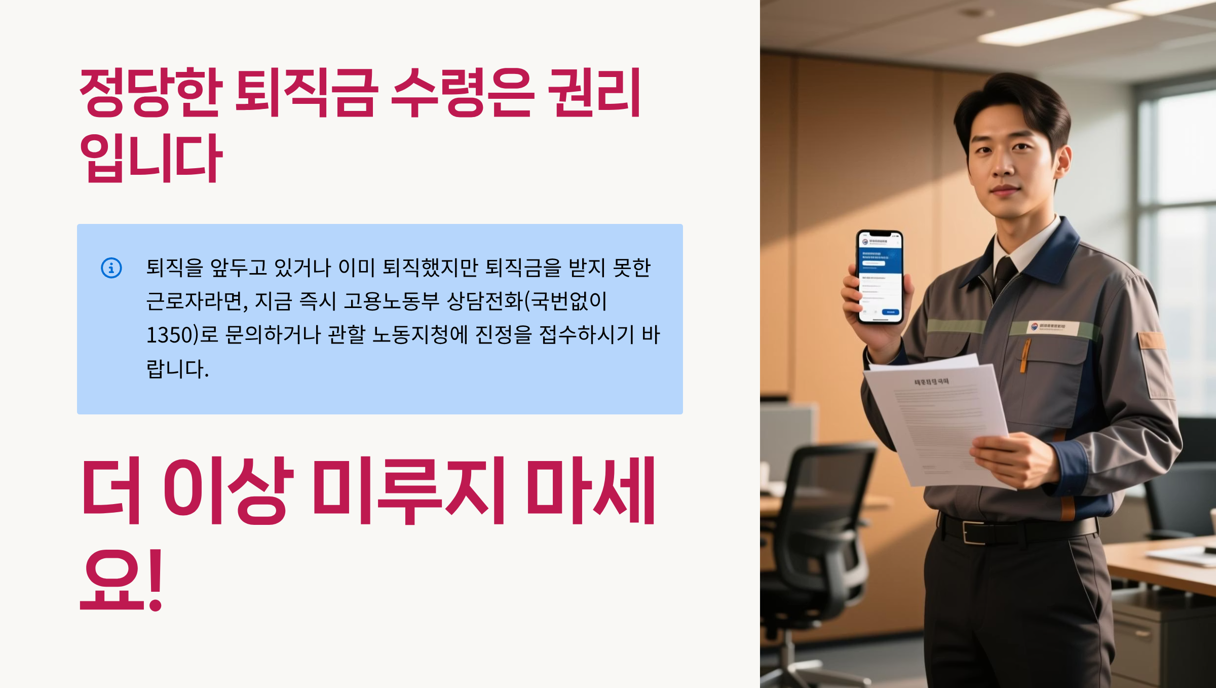 퇴직을 앞두고 있거나 이미 퇴직했지만 퇴직금을 받지 못한 근로자라면, 지금 즉시 고용노동부 상담전화(국번없이 1350)로 문의하거나 관할 노동지청에 진정을 접수하시기 바랍니다.