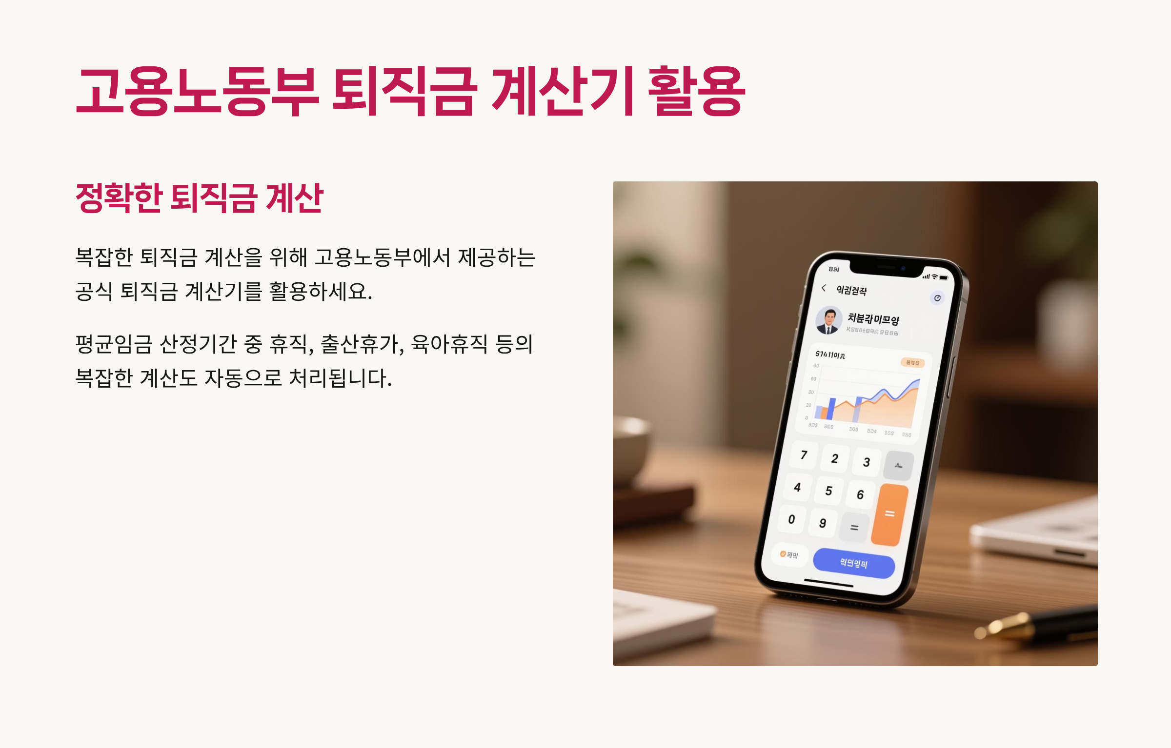 복잡한 퇴직금 계산을 위해 고용노동부에서 제공하는 공식 퇴직금 계산기를 활용하세요. 평균임금 산정기간 중 휴직, 출산휴가, 육아휴직 등의 복잡한 계산도 자동으로 처리됩니다.