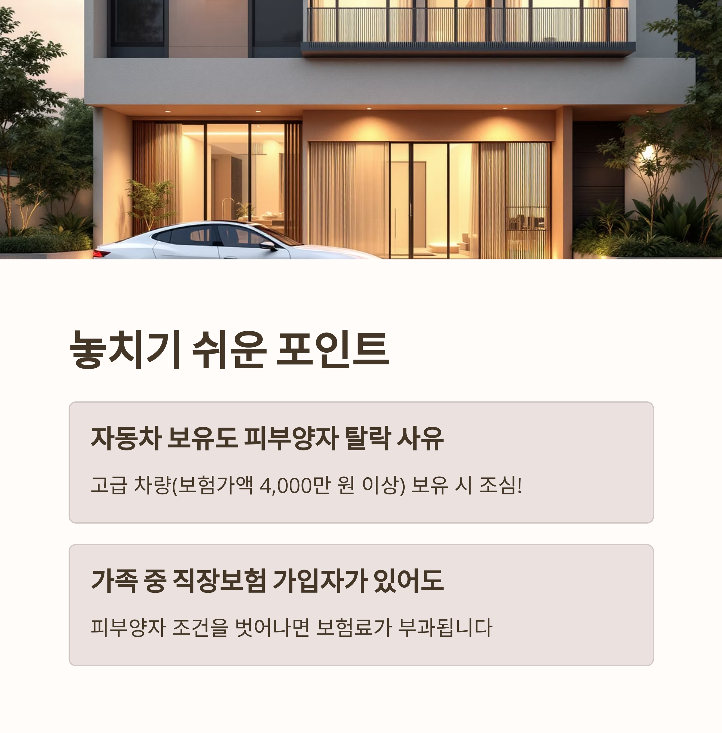 - 자동차도 피부양자 탈락 사유 → 보험가액 4,000만 원 이상 차량은 주의