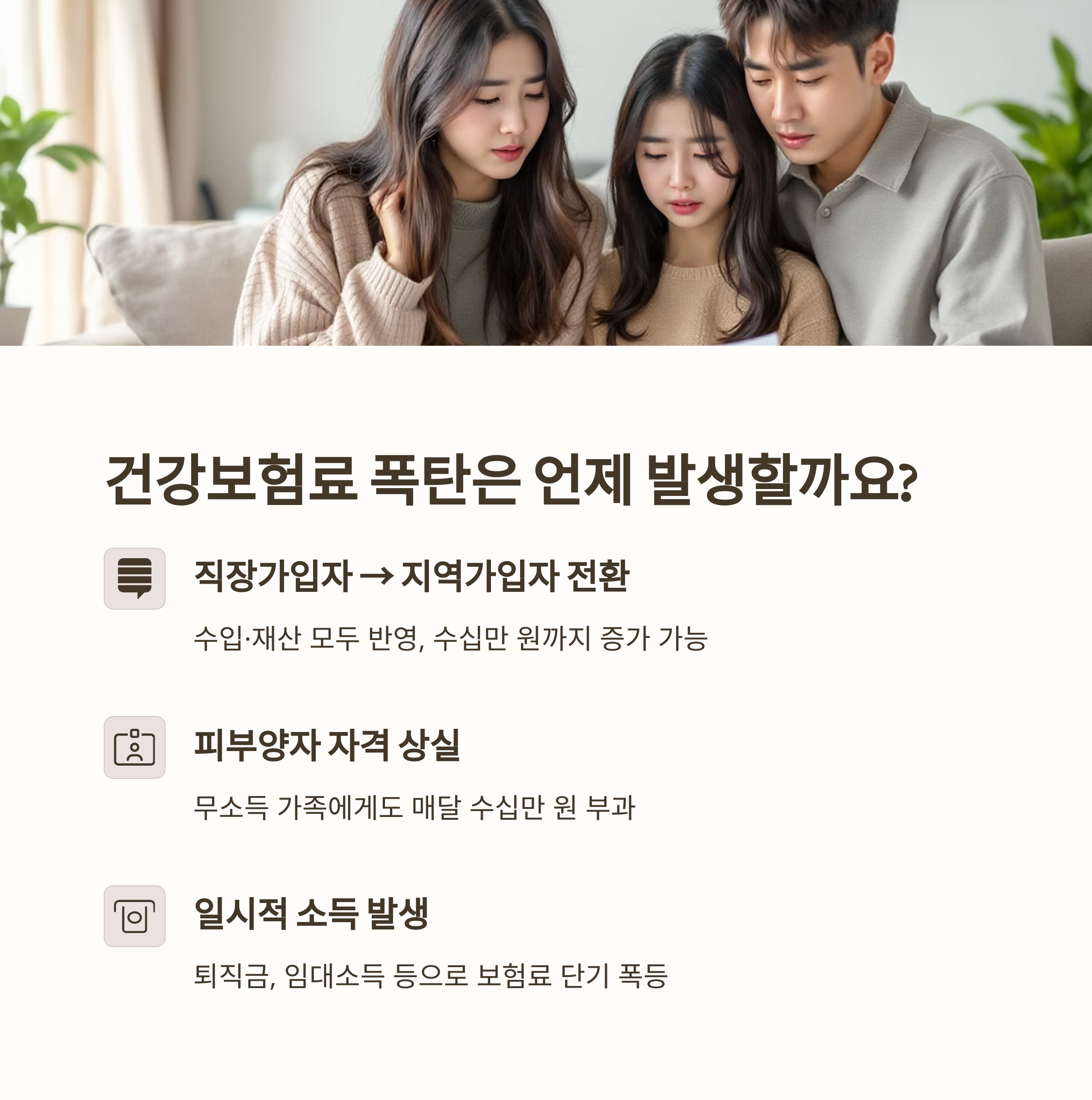 | 직장가입자 → 지역가입자 | 수입·재산 모두 반영, 수십만 원까지 증가 가능 |