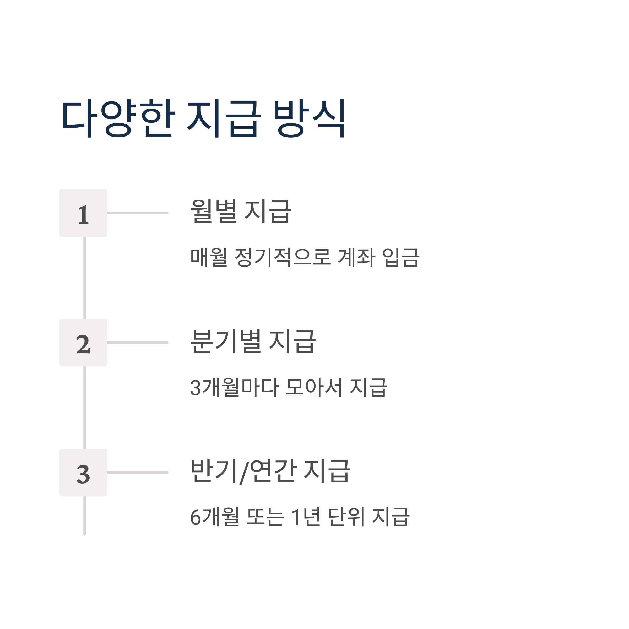 지급 방식도 지역마다 다릅니다. 월별 지급, 분기별 지급, 반기별 또는 연 1회 지급하는 곳으로 나뉩니다.