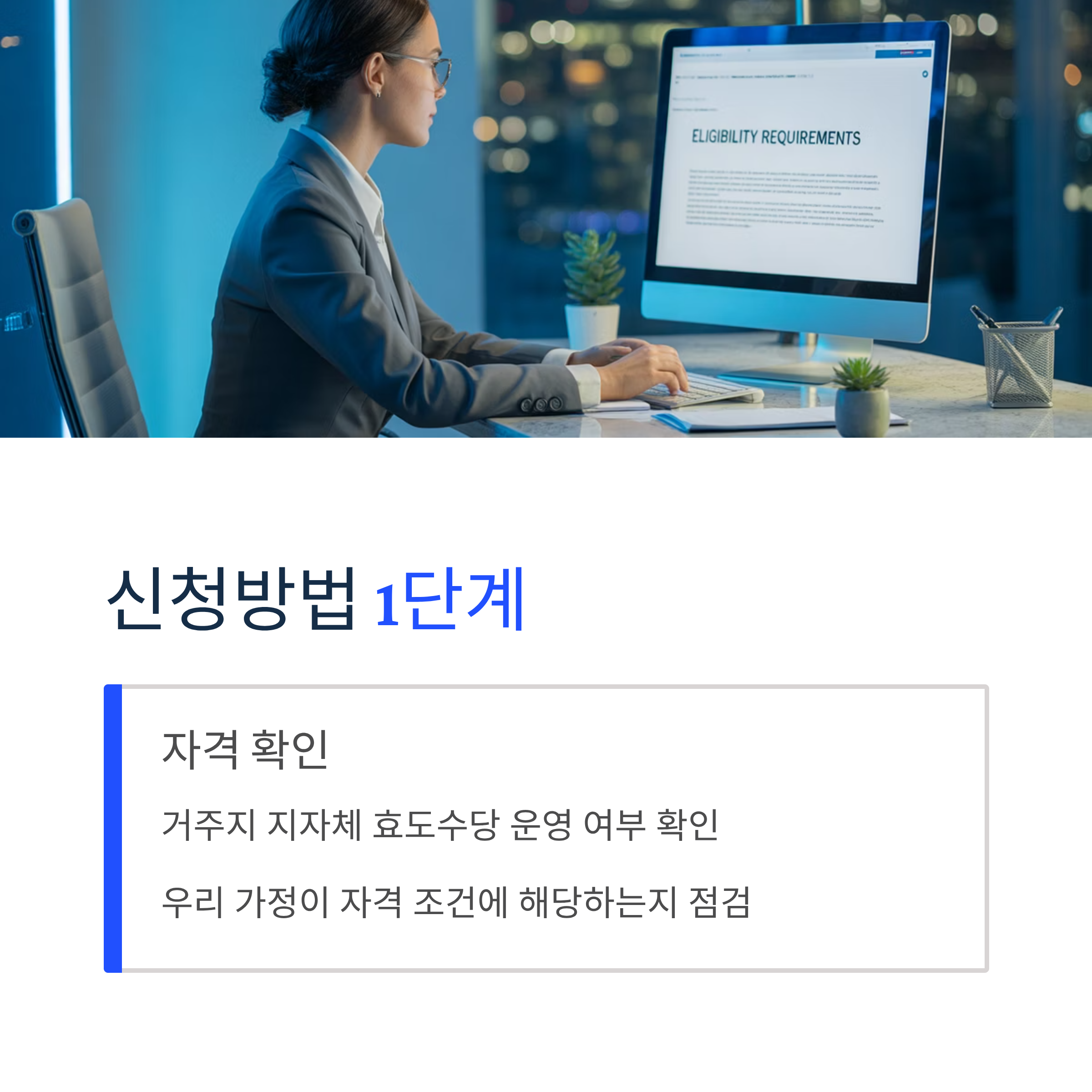 거주지 지자체에서 효도수당을 운영하는지, 본인 가정이 자격 조건에 해당하는지 먼저 확인하세요.
