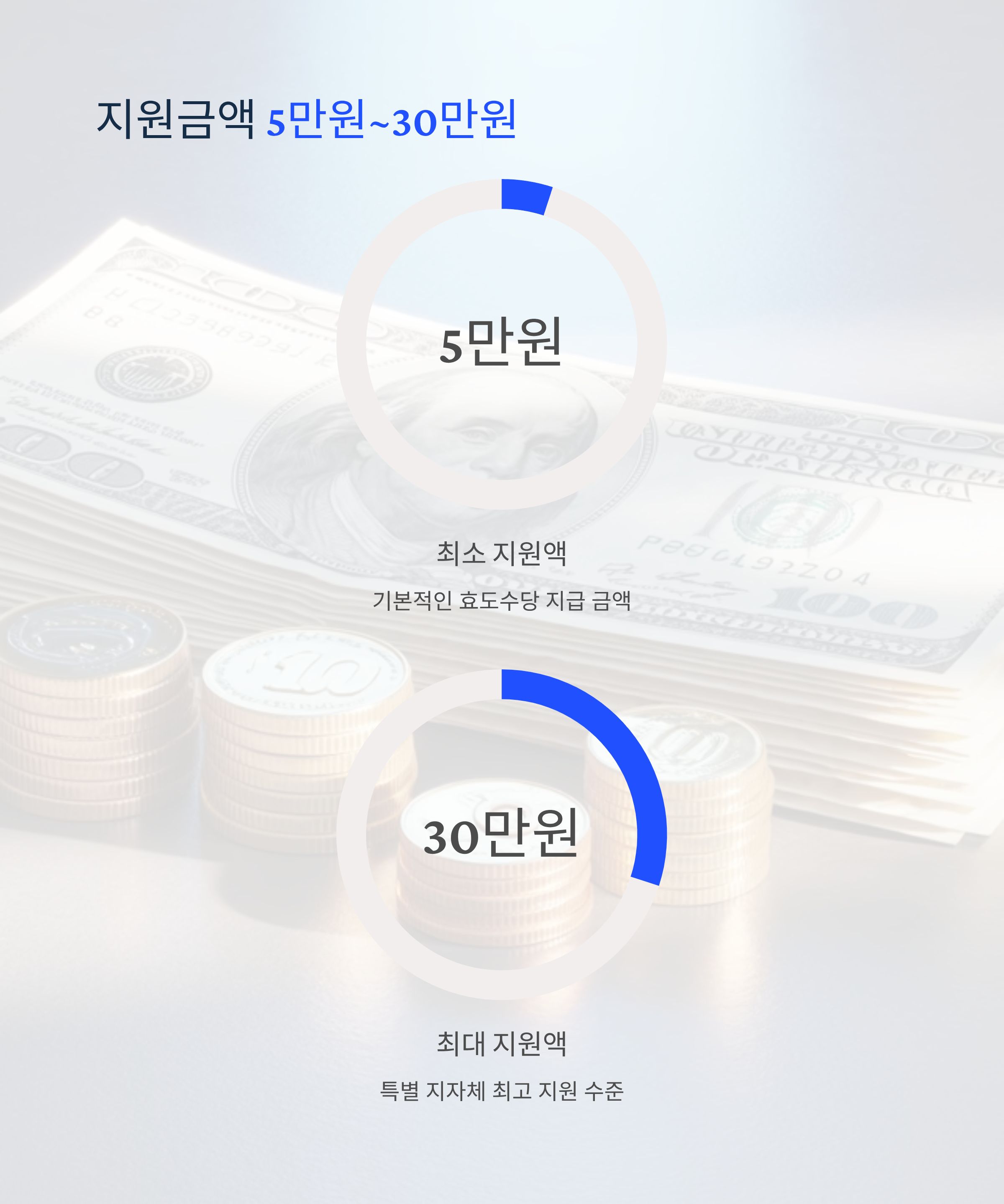 효도수당 지원금액은 최소 50,000원에서 최대 300,000원까지 지원하고 있습니다. 지역별 지급 금액 차이가 크므로 거주지역 확인이 필수입니다.