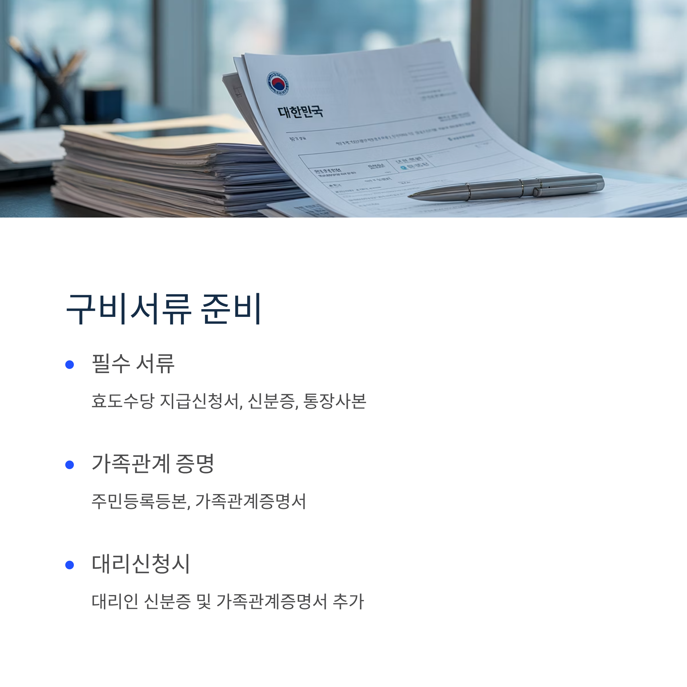 효도수당 지급신청서, 신분증, 통장사본, 대리인 신분증 및 가족관계증명서(대리신청에 한함)