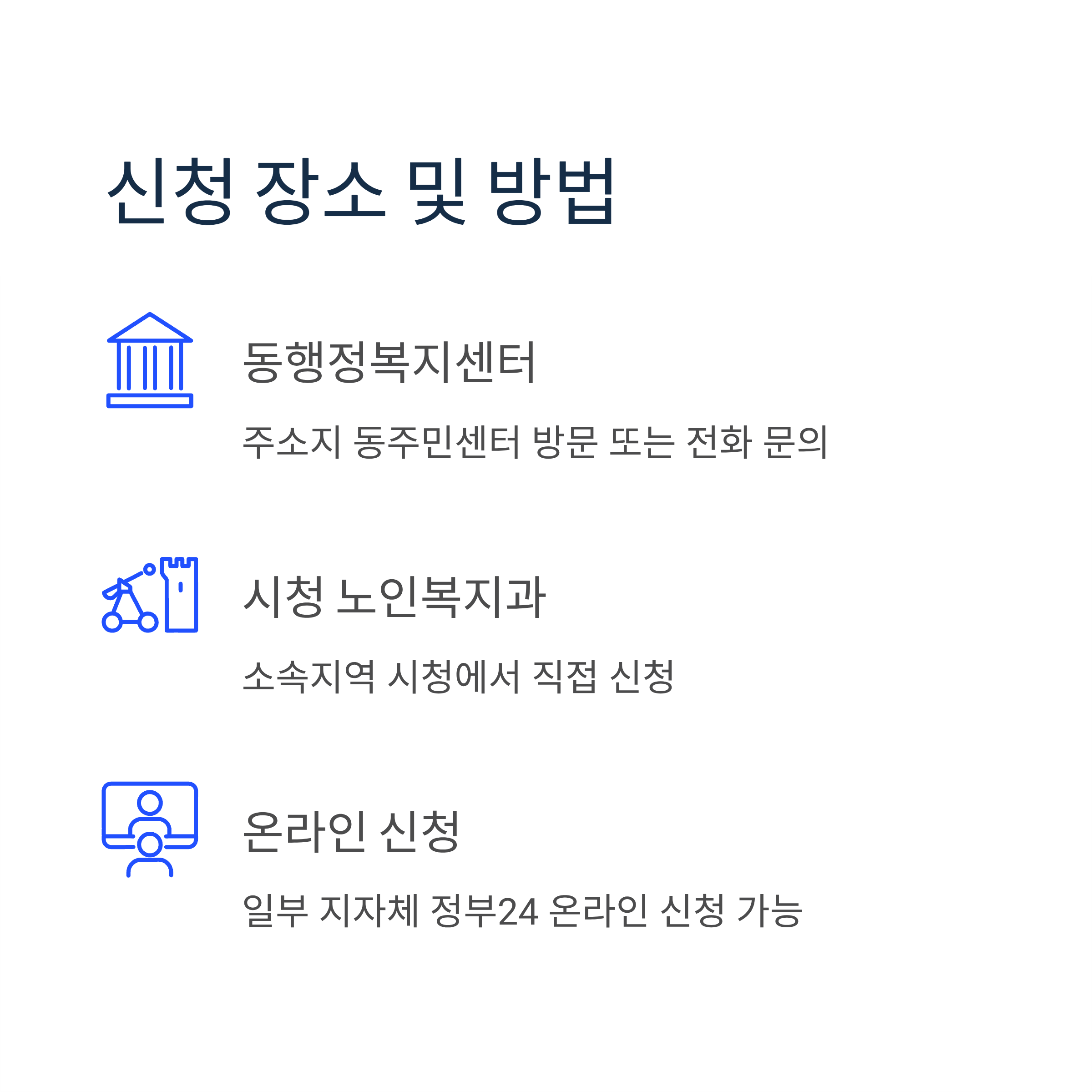 - 소속지역의 시청 노인복지과에 방문 또는 전화