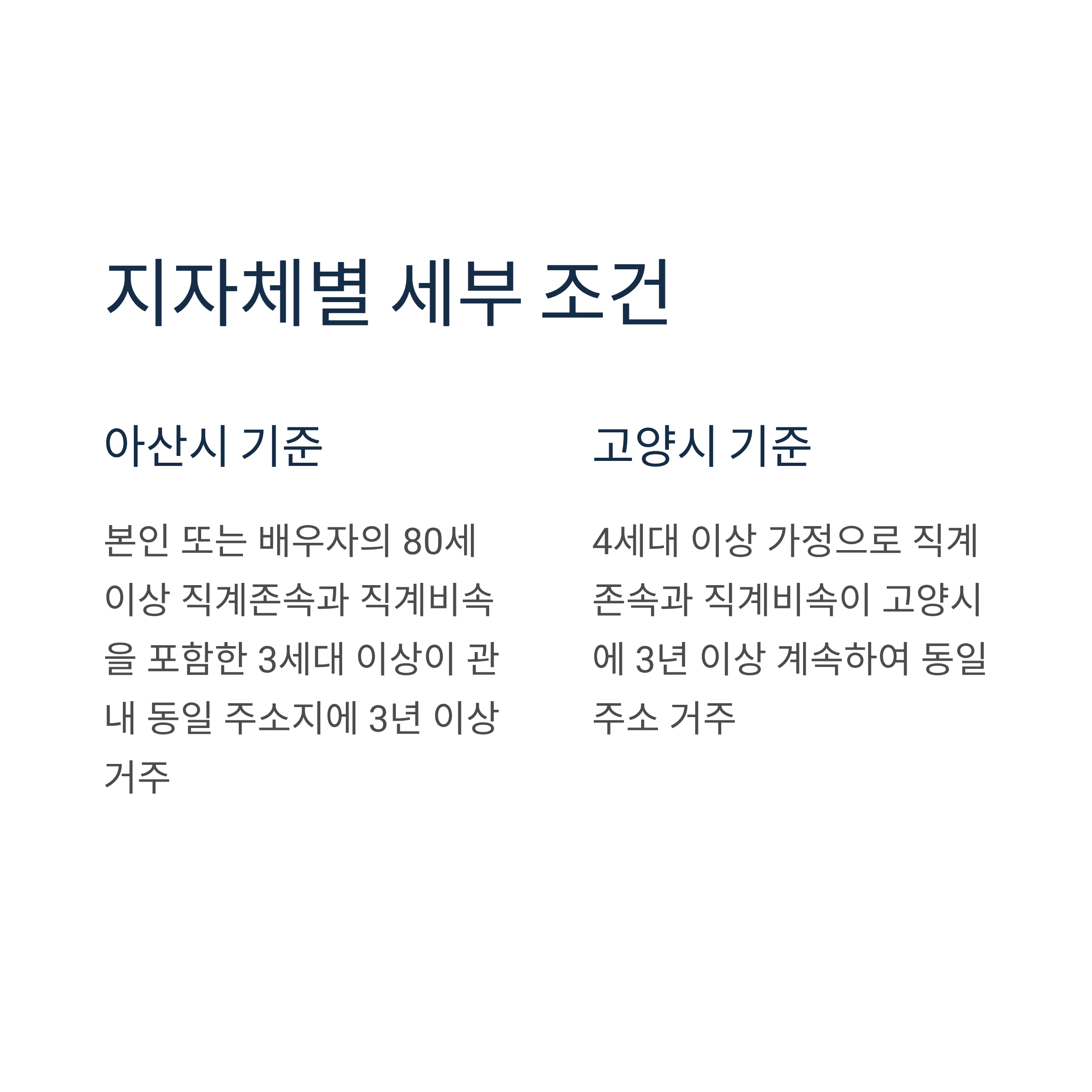 본인 또는 배우자의 80세 이상 직계존속과 직계비속을 포함한 3세대 이상이 관내 동일 주소지에 3년 이상 주민등록을 두고 거주하는 가정