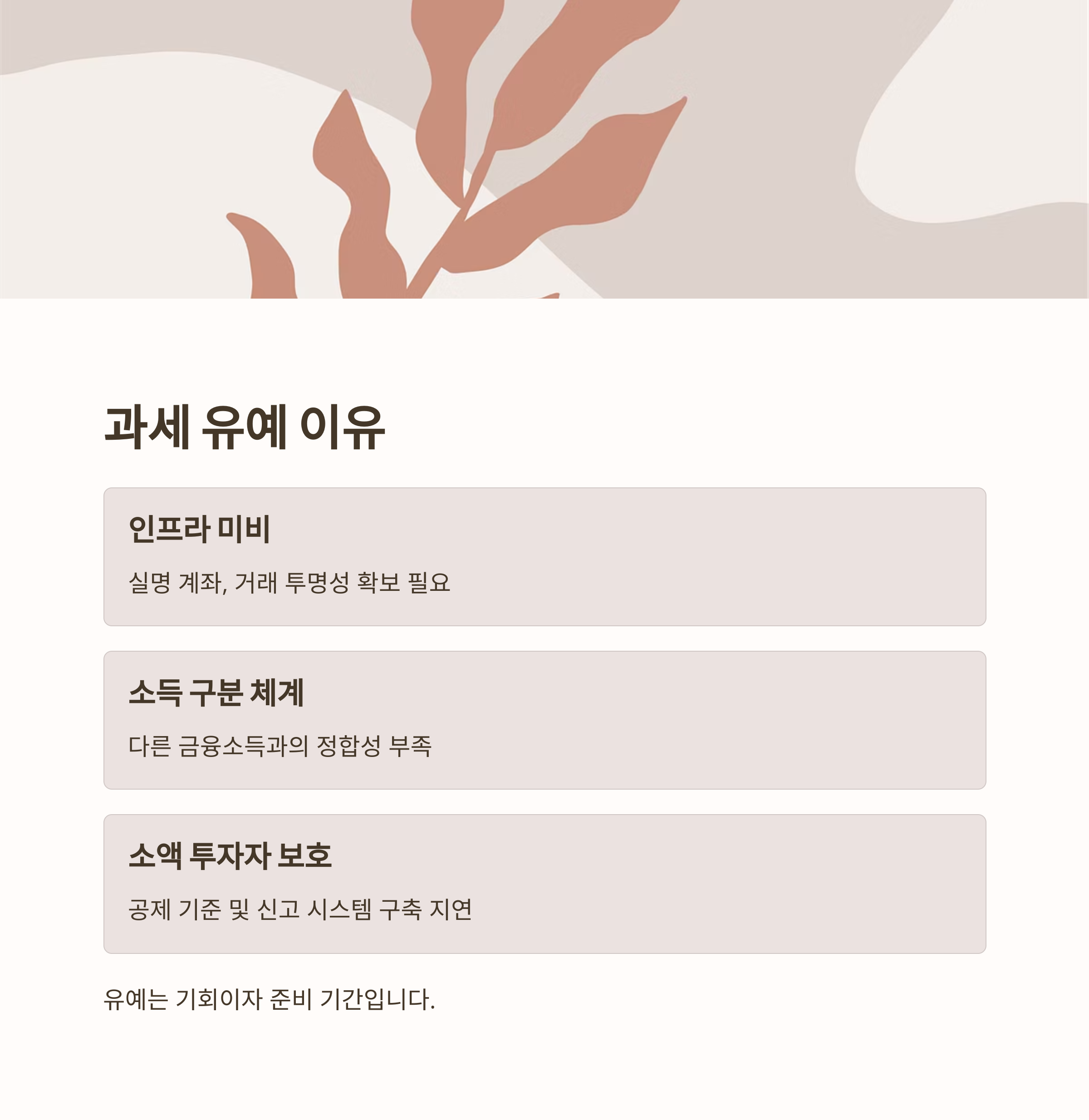 2023년 도입 예정이었던 가상자산 과세는 두 차례 유예되었고,