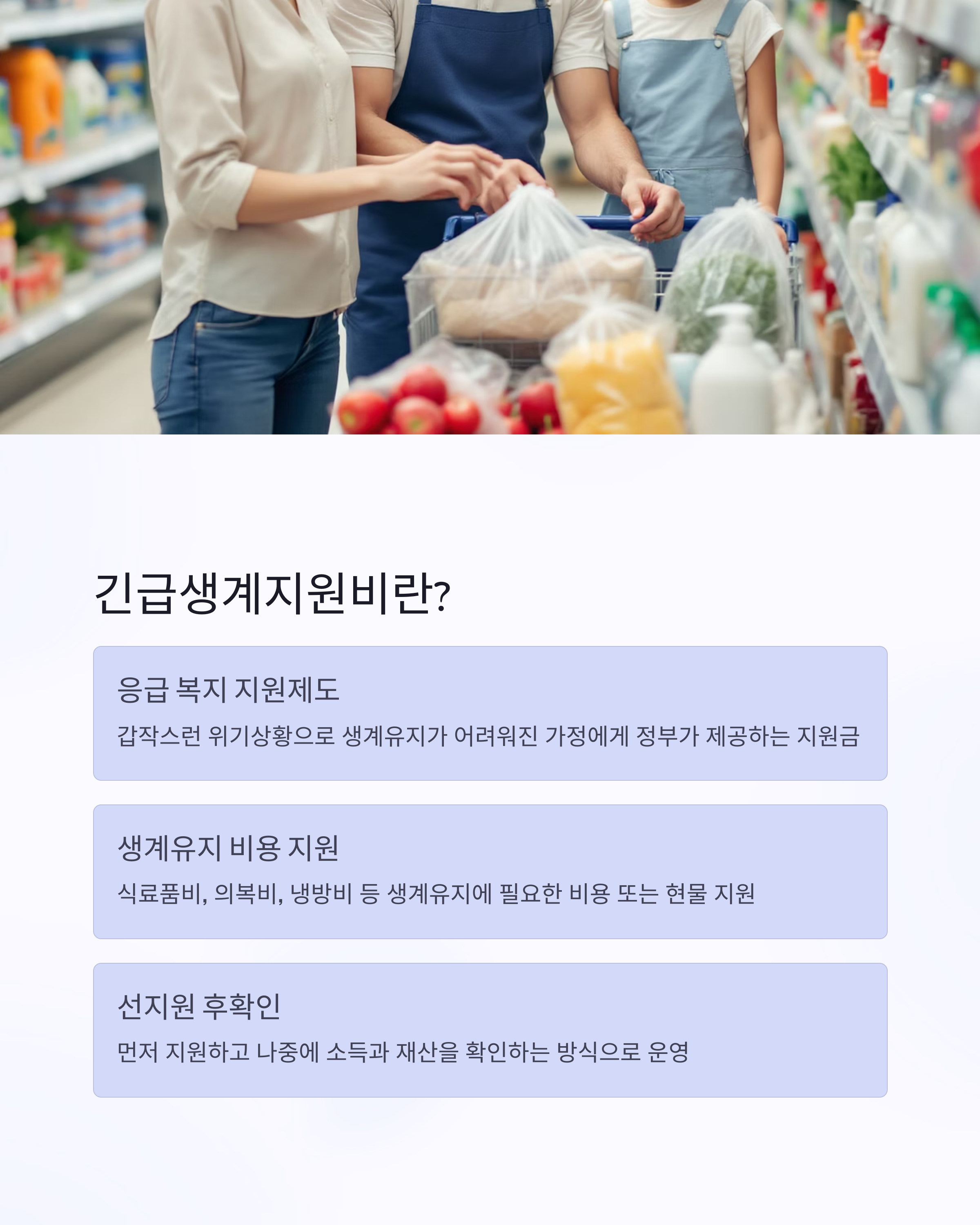 긴급생계지원비는 갑작스런 위기상황으로 생계유지가 어려워진 가정에게 정부가 제공하는 응급 복지 지원제도입니다. 식료품비, 의복비, 냉방비 등 생계유지에 필요한 비용 또는 현물을 지원하며, 먼저 지원하고 나중에 소득과 재산을 확인하는 '선지원 후확인' 방식으로 운영됩니다.