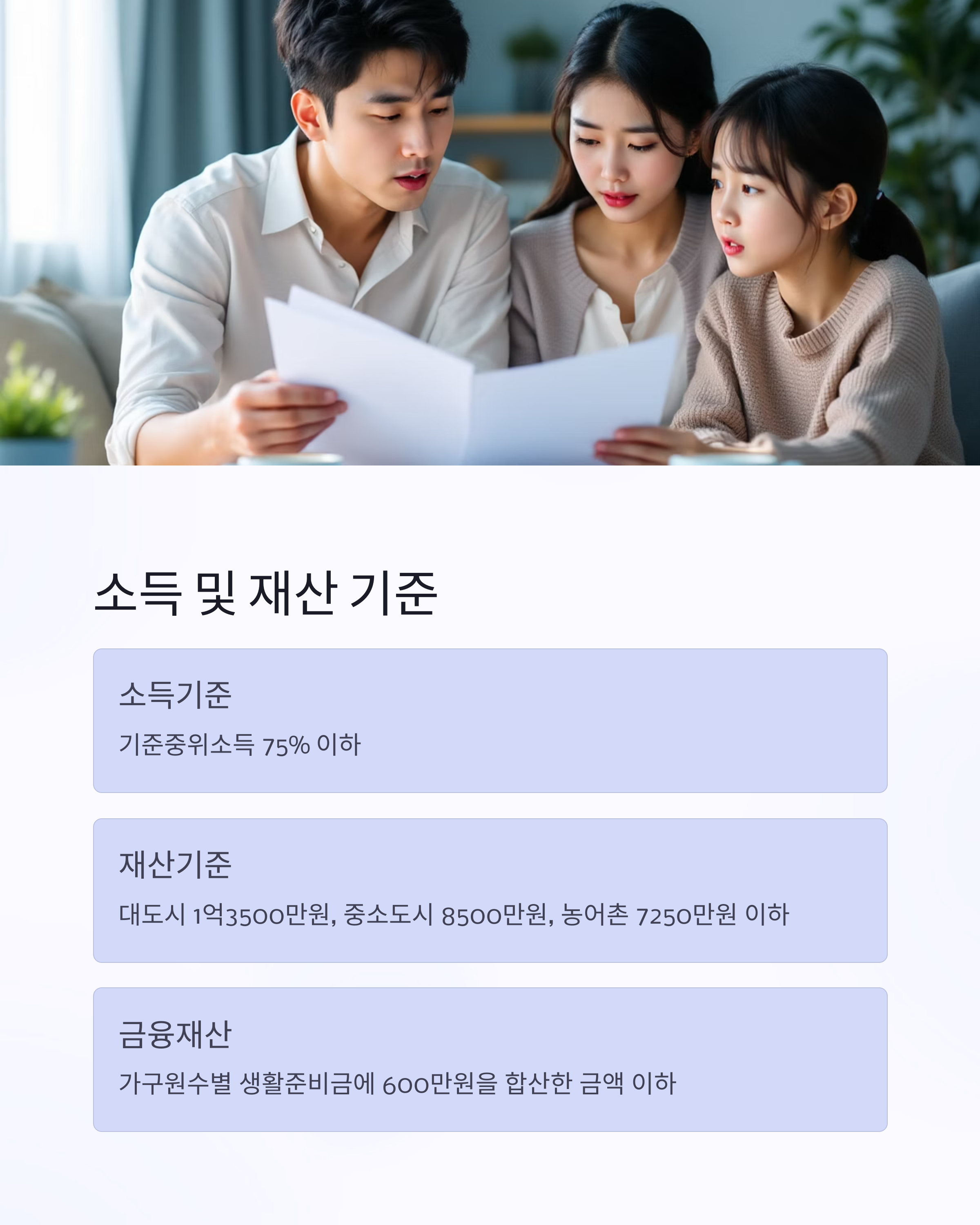 - 재산기준: 대도시 1억3500만원, 중소도시 8500만원, 농어촌 7250만원 이하