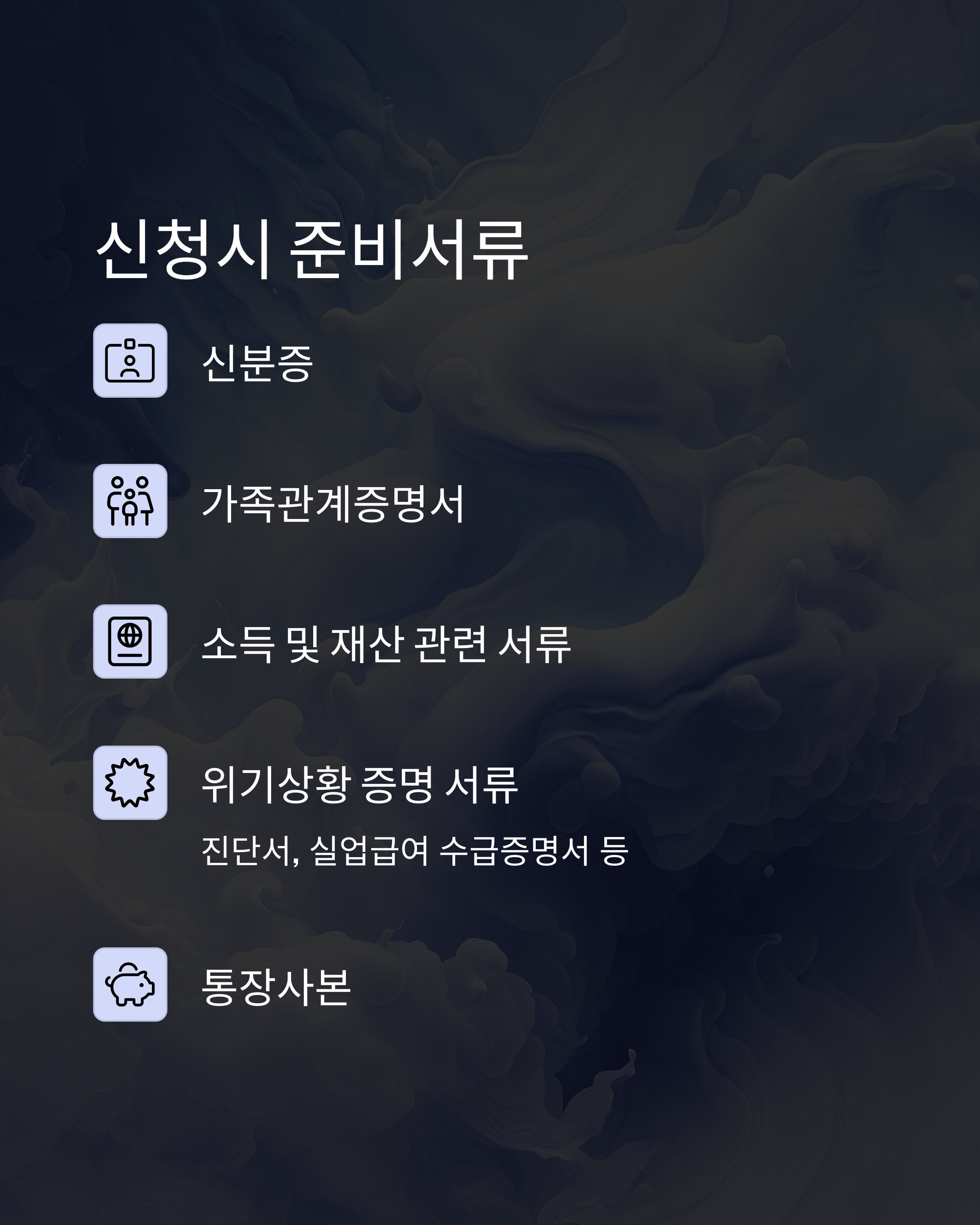 - 위기상황을 증명할 수 있는 서류 (진단서, 실업급여 수급증명서 등)