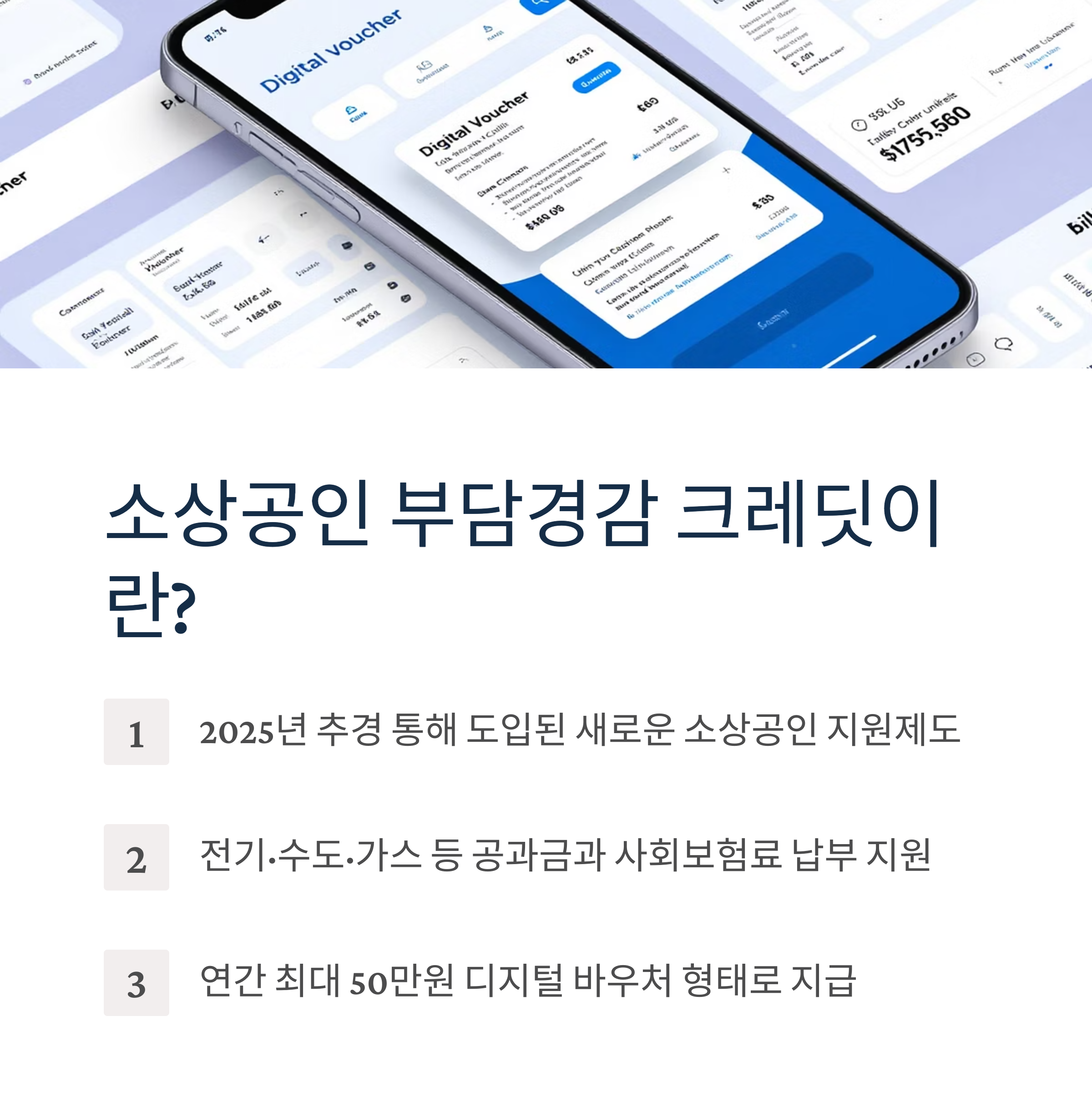 소상공인 부담경감 크레딧은 2025년 추경을 통해 정부가 새롭게 도입한 소상공인 지원 제도입니다. 내수 부진과 고정비 부담으로 어려움을 겪는 소상공인들이 전기·수도·가스 등 공과금과 사회보험료를 납부할 수 있도록 연간 최대 50만원을 디지털 바우처 형태로 지원합니다.