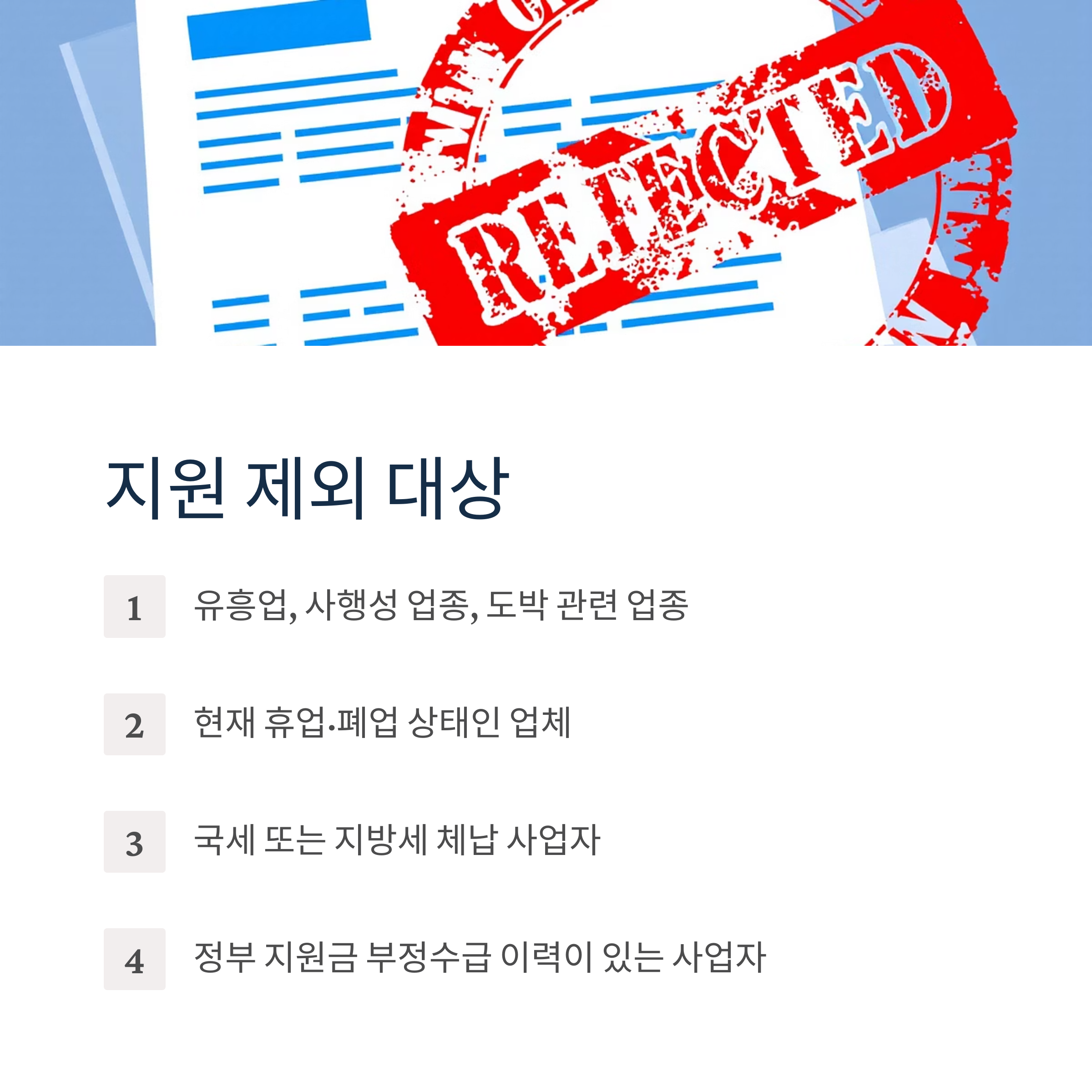 다음 업종 및 조건에 해당하는 경우 지원에서 제외됩니다: