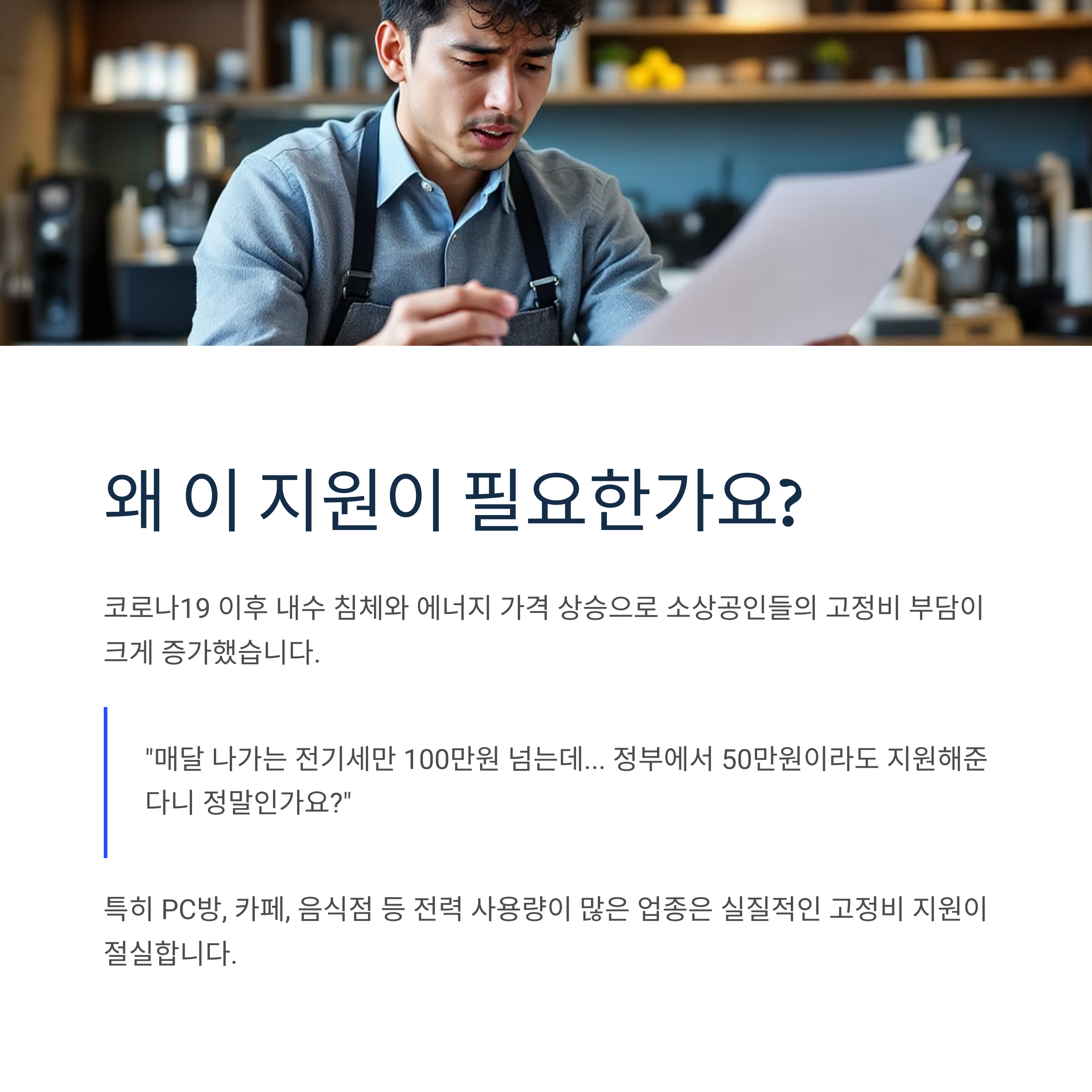 코로나19 이후 지속된 내수 침체와 최근 에너지 가격 상승으로 소상공인들의 고정비 부담이 크게 늘어났습니다. 특히 PC방, 카페, 음식점 등 전력 사용량이 많은 업종의 경우 월 전기료만 수백만원에 달하는 경우도 많아 실질적인 고정비 지원이 절실한 상황입니다.