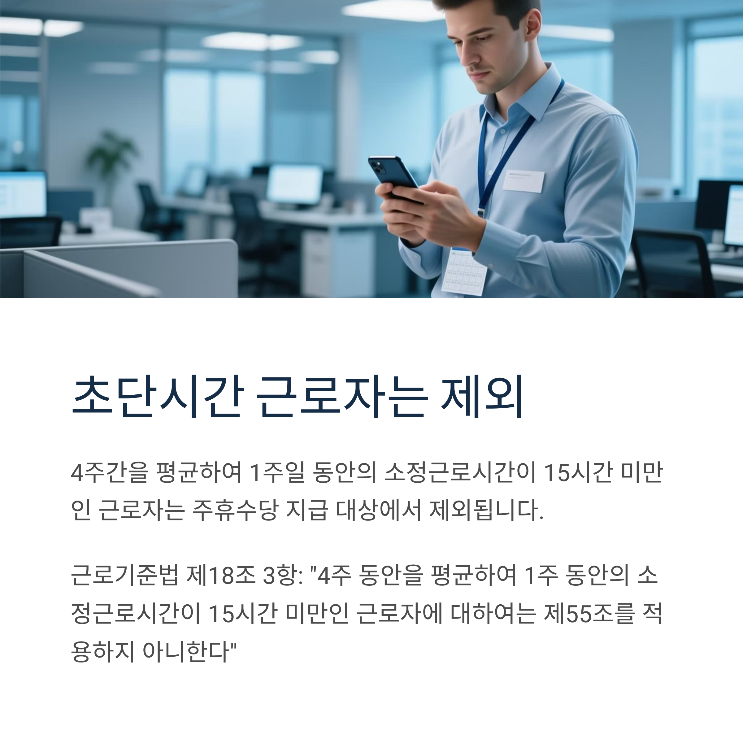 4주간을 평균하여 1주일 동안의 '소정근로시간'이 15시간 미만인 근로자를 초단시간 근로자라고 하며, 1주 15시간 미만 근로자는 주휴수당 지급 의무가 없다는 것을 법적으로 명시하고 있습니다.