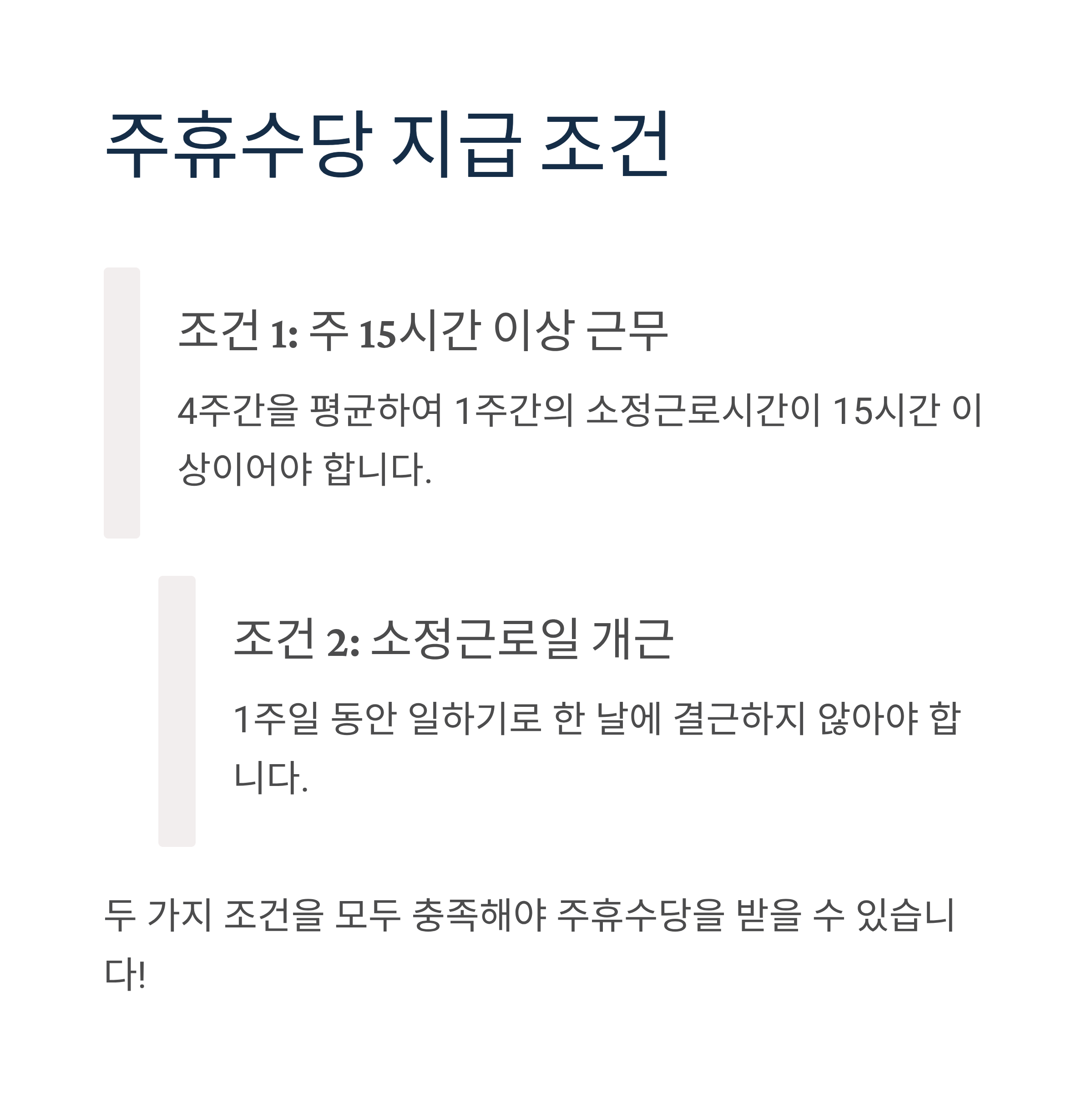 주휴수당을 받기 위해서는 다음 두 가지 조건을 모두 충족해야 합니다: