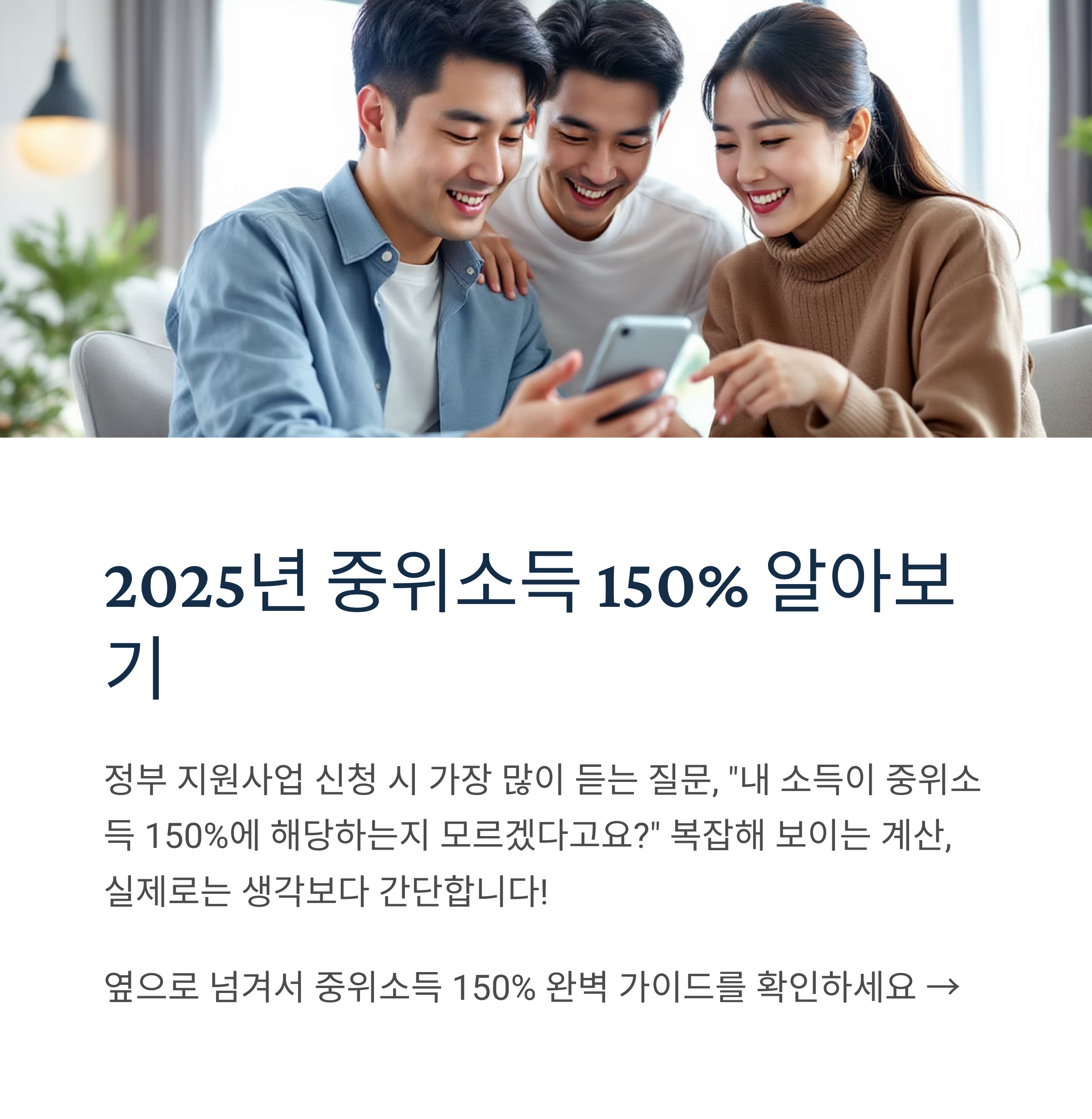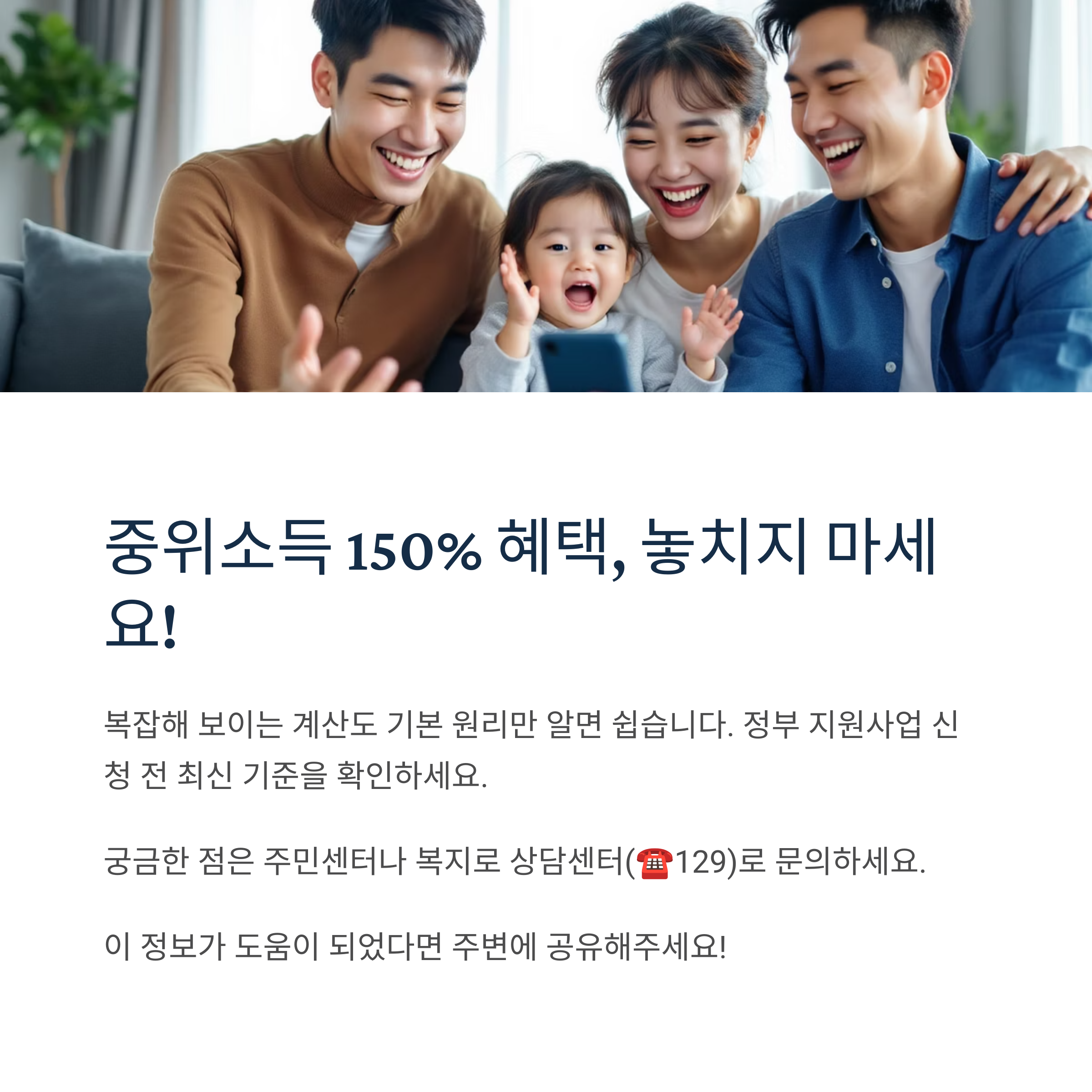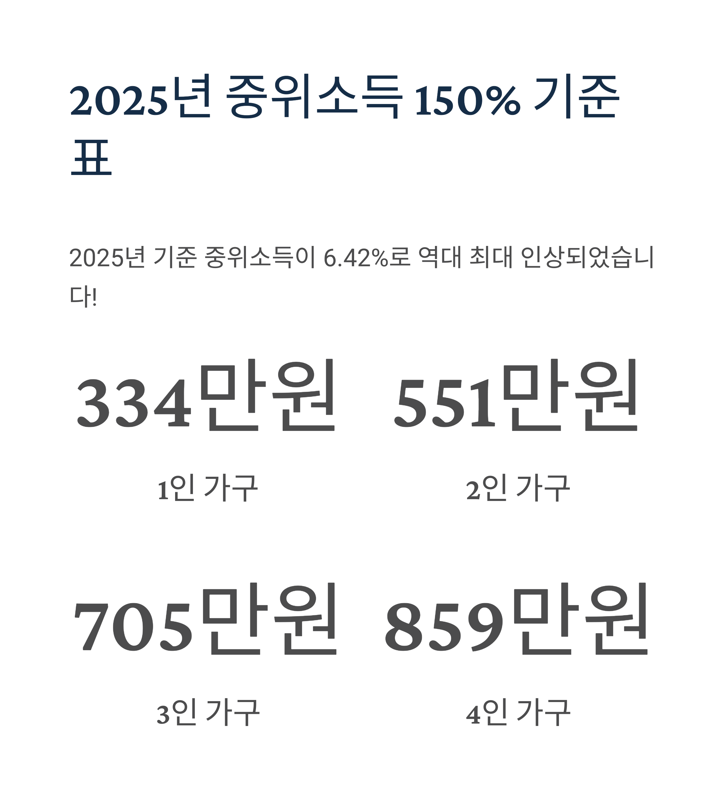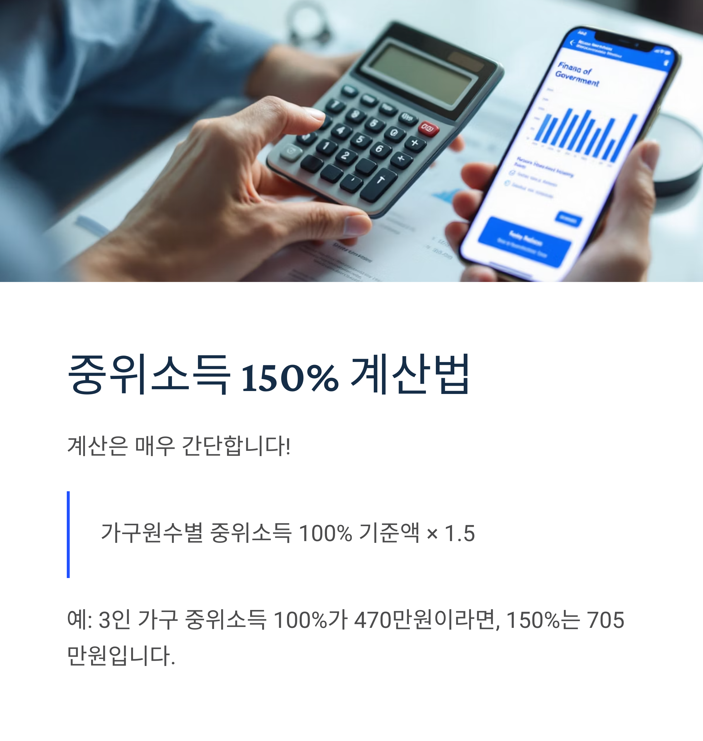 - 중위소득 150% = 가구별 중위소득 100% × 1.5