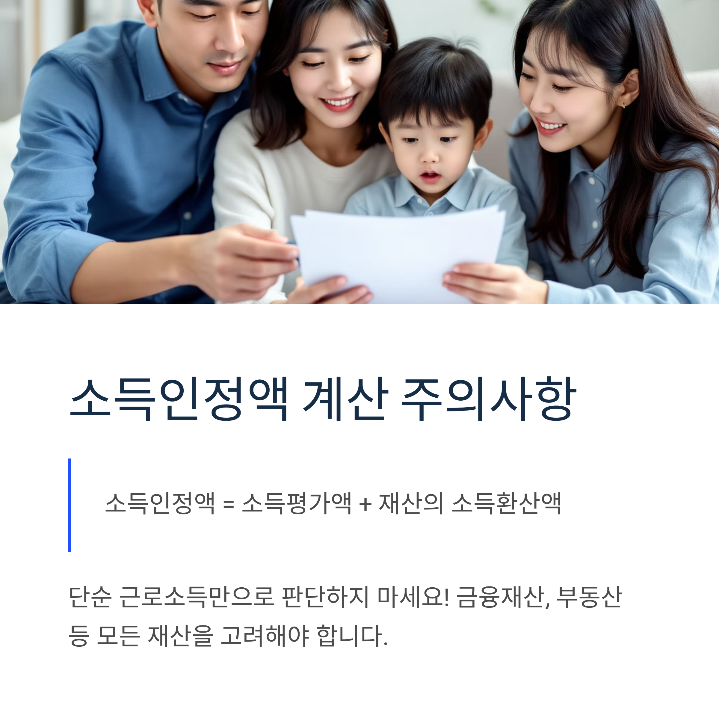 따라서 단순히 근로소득만으로 판단하면 안 되고, 금융재산, 부동산 등을 모두 고려해야 합니다.
