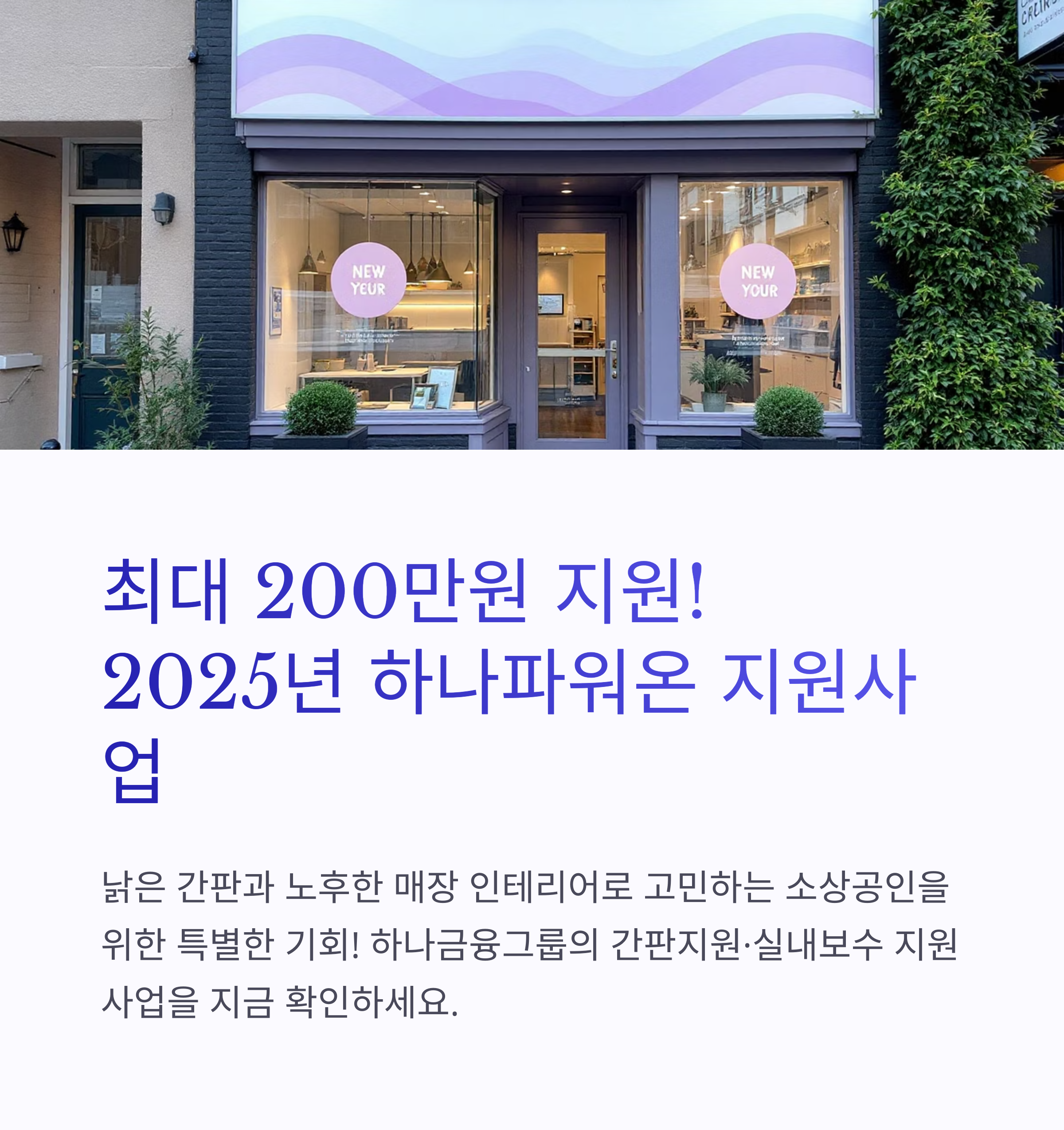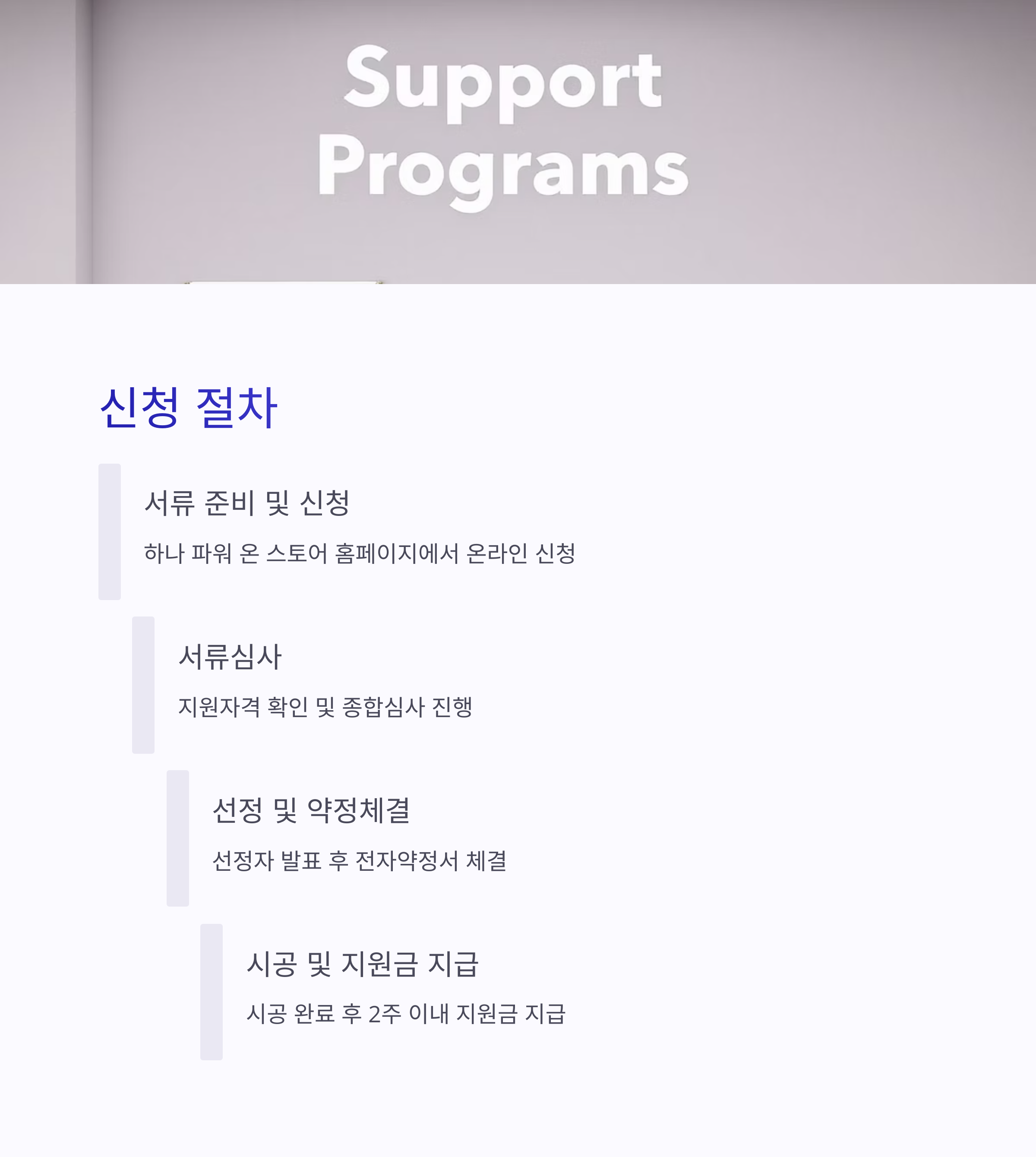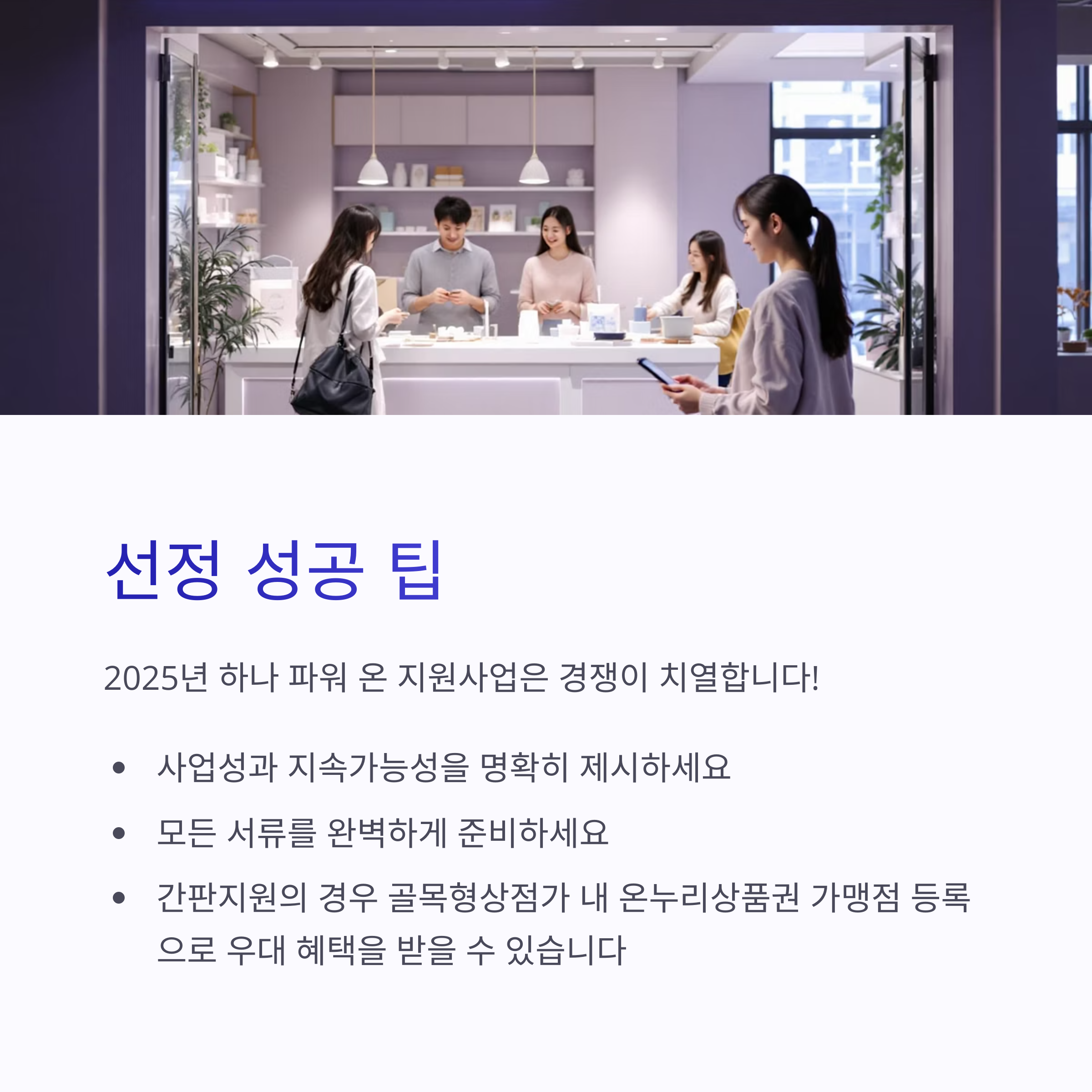 2025년 하나 파워 온 지원사업은 경쟁이 치열합니다. 성공적인 선정을 위해서는 사업성과 지속가능성을 명확히 제시하고, 모든 서류를 완벽하게 준비하는 것이 중요합니다. 특히 간판지원의 경우 골목형상점가 내 온누리상품권 가맹점 등록을 통해 우대 혜택을 받을 수 있으니 미리 준비하시기 바랍니다.