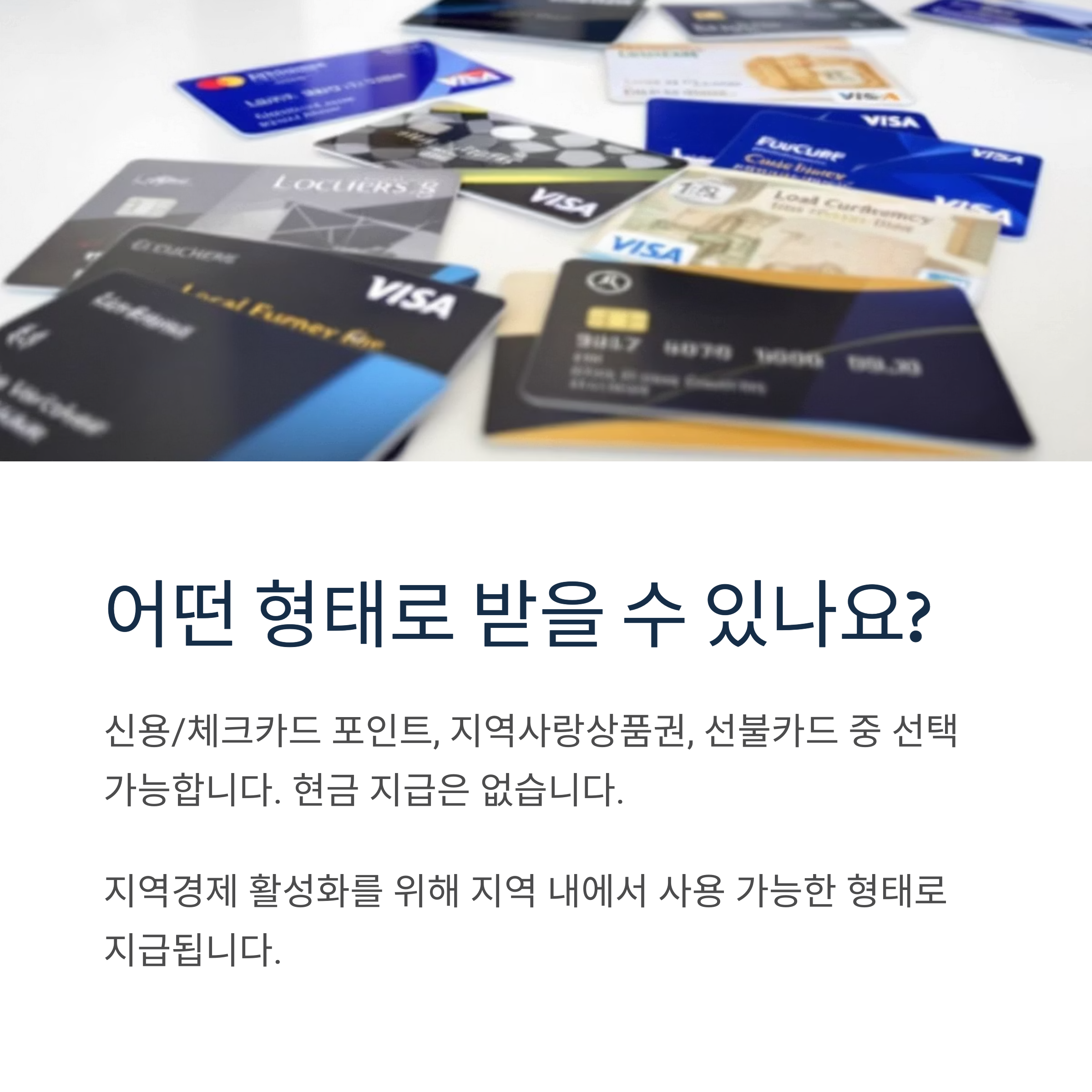 신용/체크카드 포인트, 지역사랑상품권, 선불카드 중 선택하여 받을 수 있으며, 현금 지급은 없습니다.