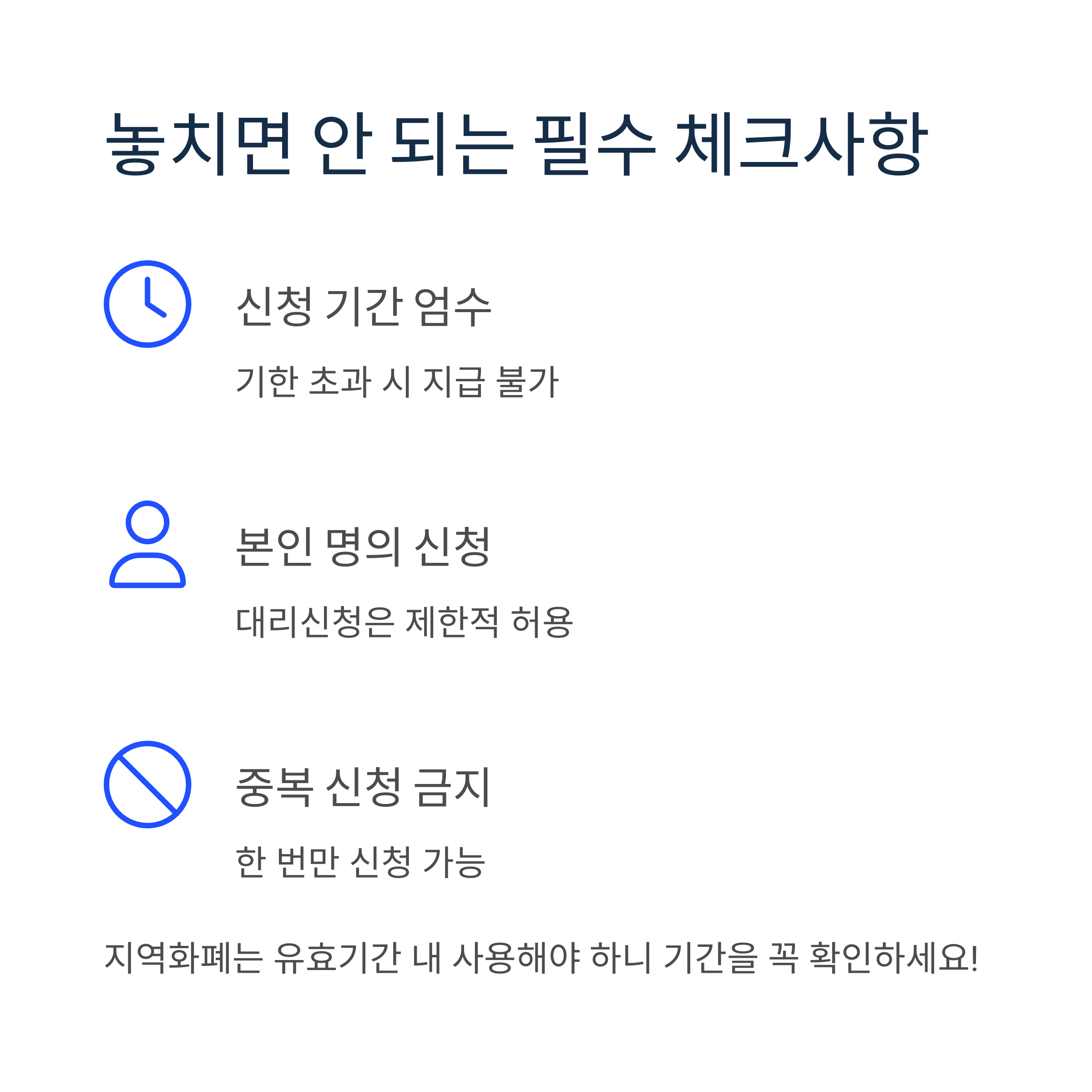 - 사용 기한 확인: 지역화폐 유효기간 내 사용 필수