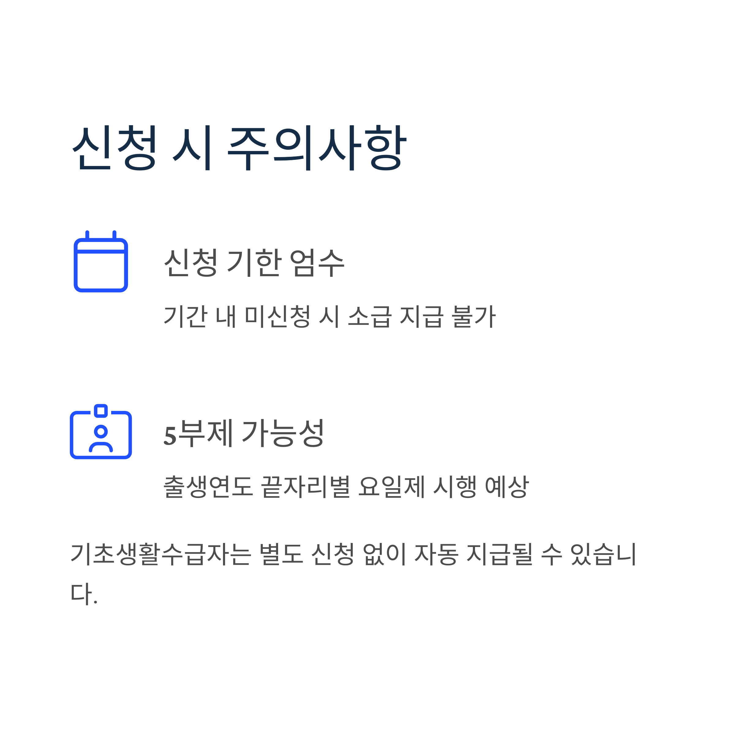- 신청 기한 엄수: 기간 내 미신청 시 소급 지급 불가