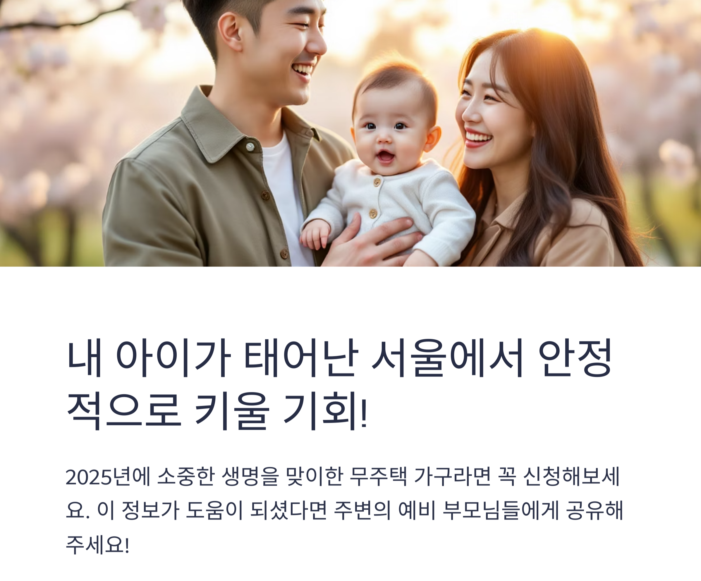 2025년 을사년 새해 태어난 아이가 있는 무주택가구를 대상으로 2년간 주거비 최대 720만 원(월 30만 원)을 지원하는 이 사업으로 서울에서의 안정적인 육아 환경을 만들어보세요.
