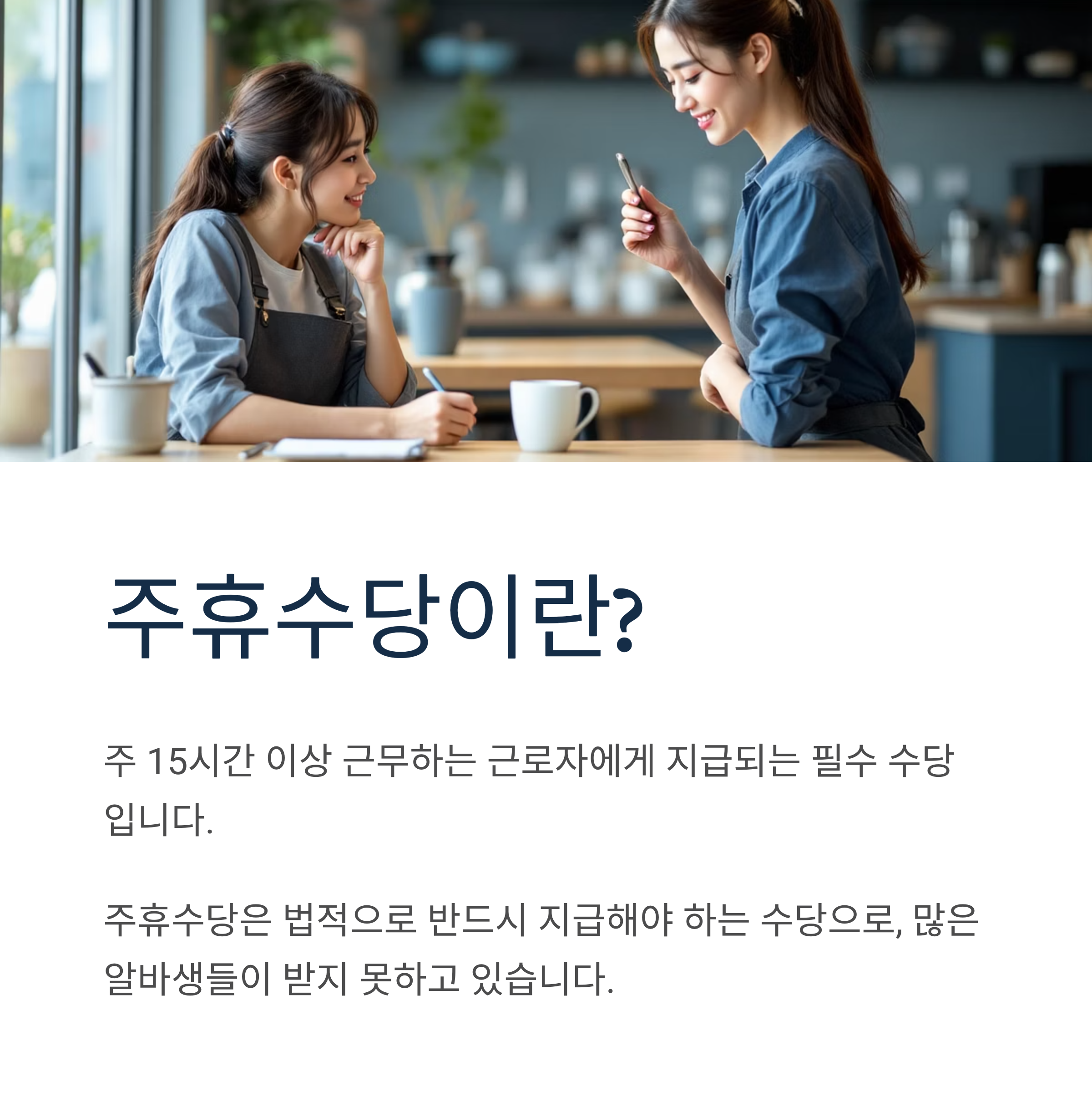 주휴수당은 주 15시간 이상 근무하는 근로자에게 지급되는 필수 수당입니다.