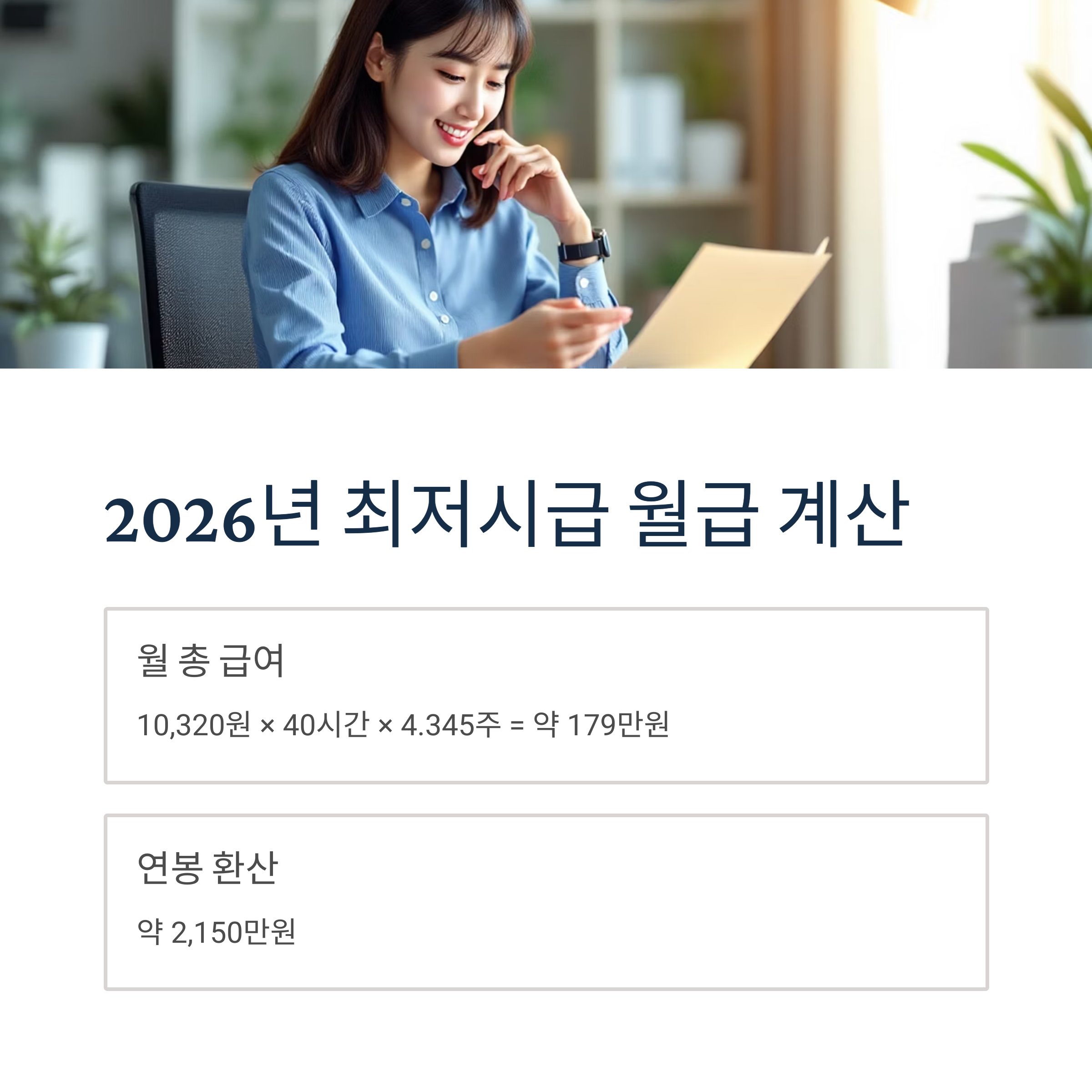 월 총 급여: 10,320원 × 40시간 × 4.345주 = 약 179만원