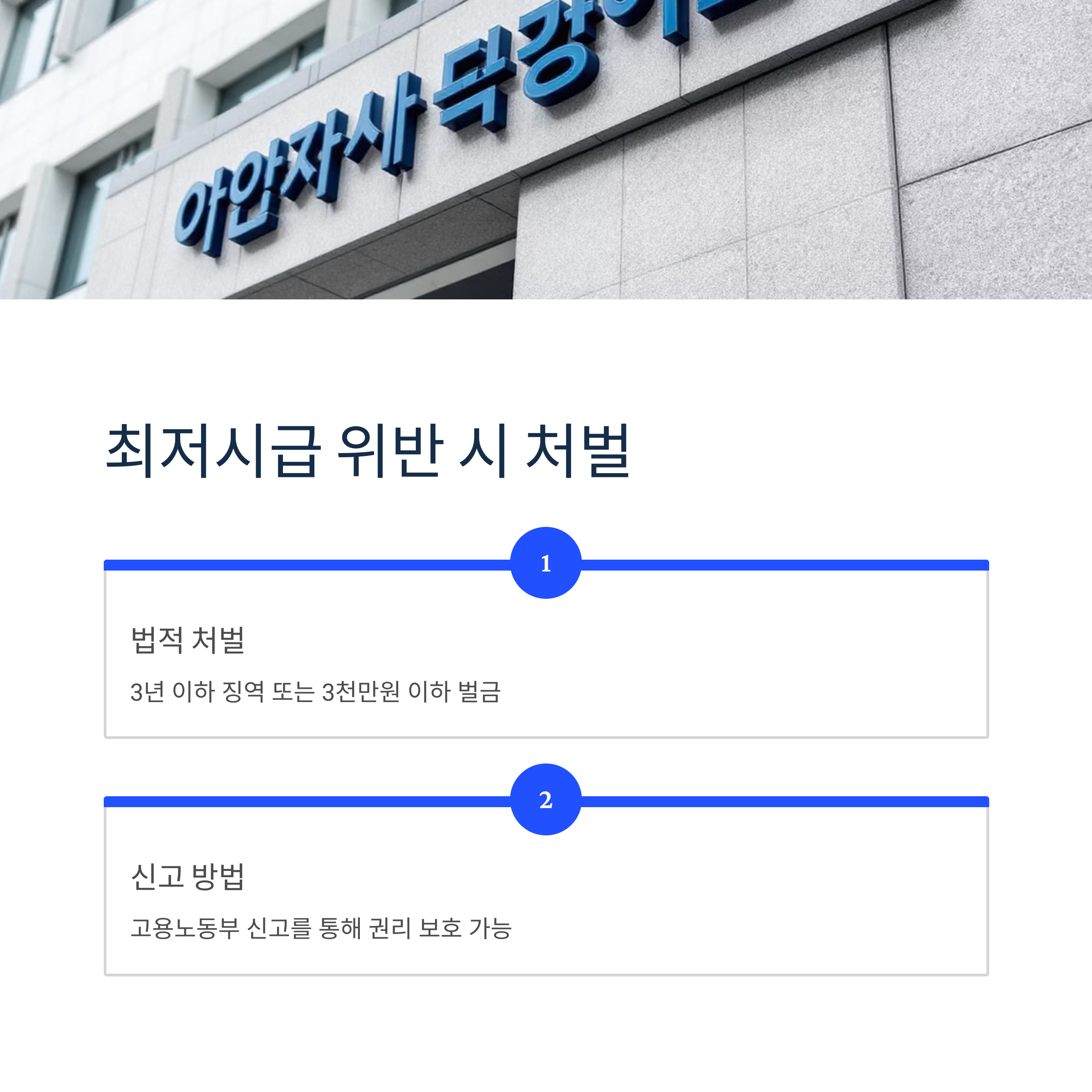 최저시급 미지급 시 3년 이하 징역 또는 3천만원 이하 벌금이 부과됩니다. 근로자는 고용노동부 신고를 통해 권리를 보호받을 수 있습니다.