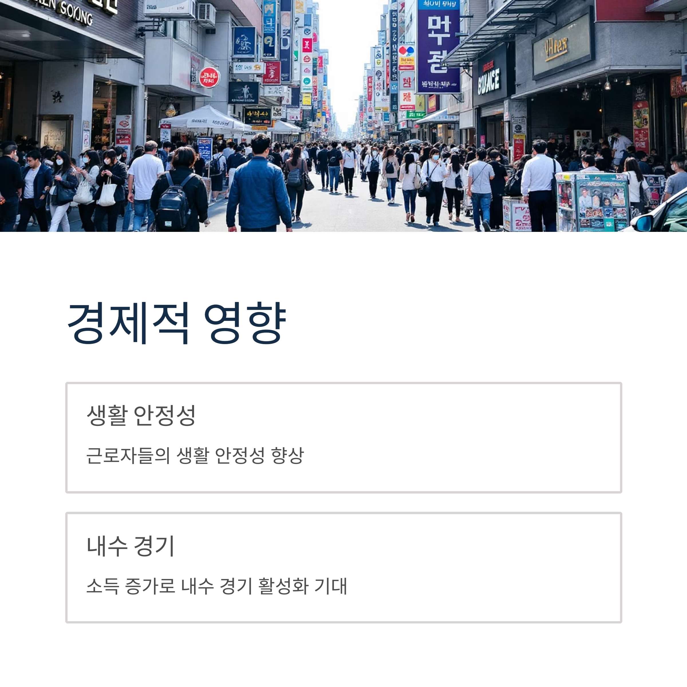 이번 인상으로 약 334만명의 근로자가 직접적인 혜택을 받을 것으로 예상됩니다. 특히 서비스업, 유통업 종사자들의 소득 증가가 예상되며, 이는 내수 경기 활성화에도 긍정적인 영향을 미칠 전망입니다.