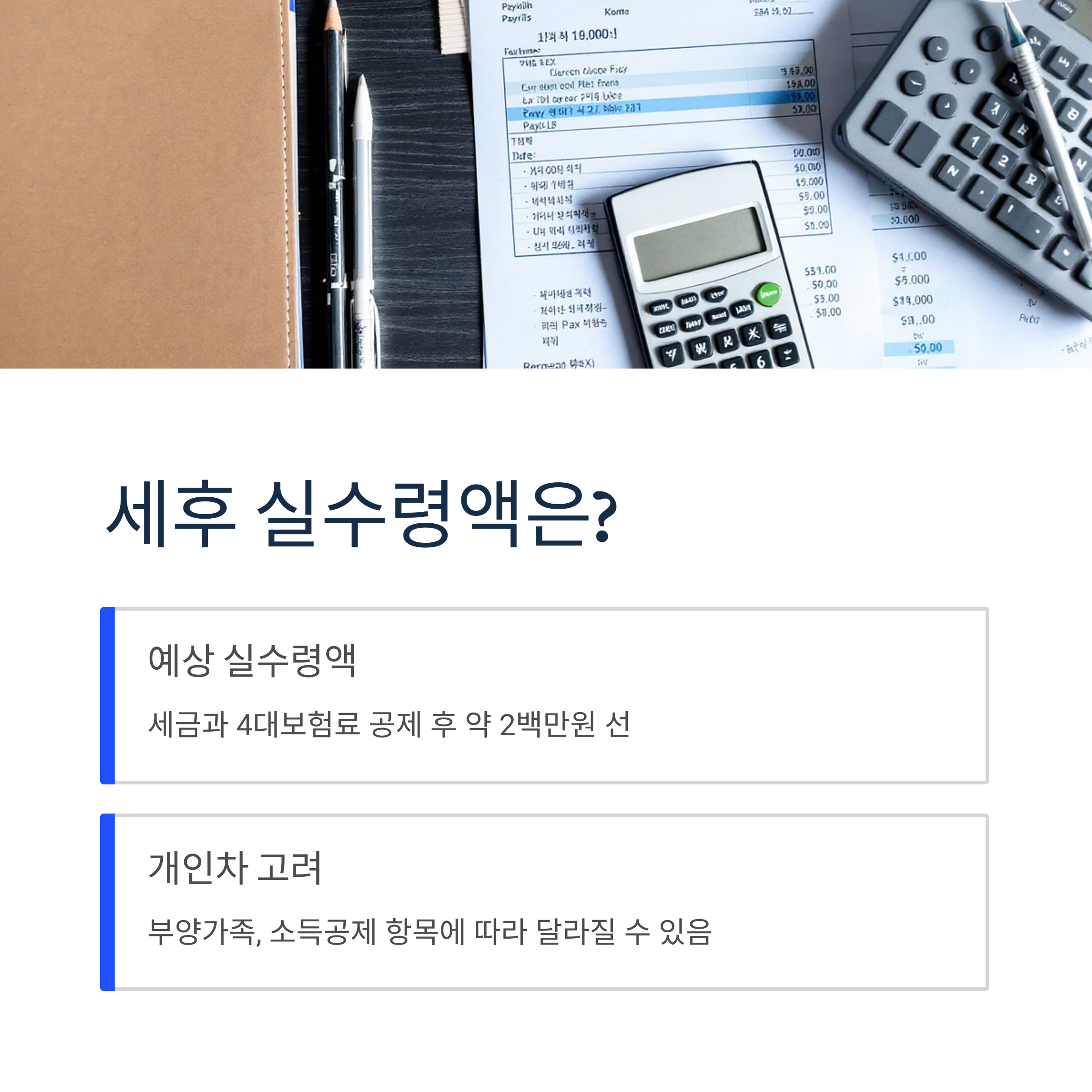 각종 세금과 4대보험료 등을 공제하면 실수령액은 2백만원 선이 될 것으로 예상됩니다. 정확한 세후 실수령액은 개인의 부양가족, 소득공제 항목에 따라 달라질 수 있습니다.