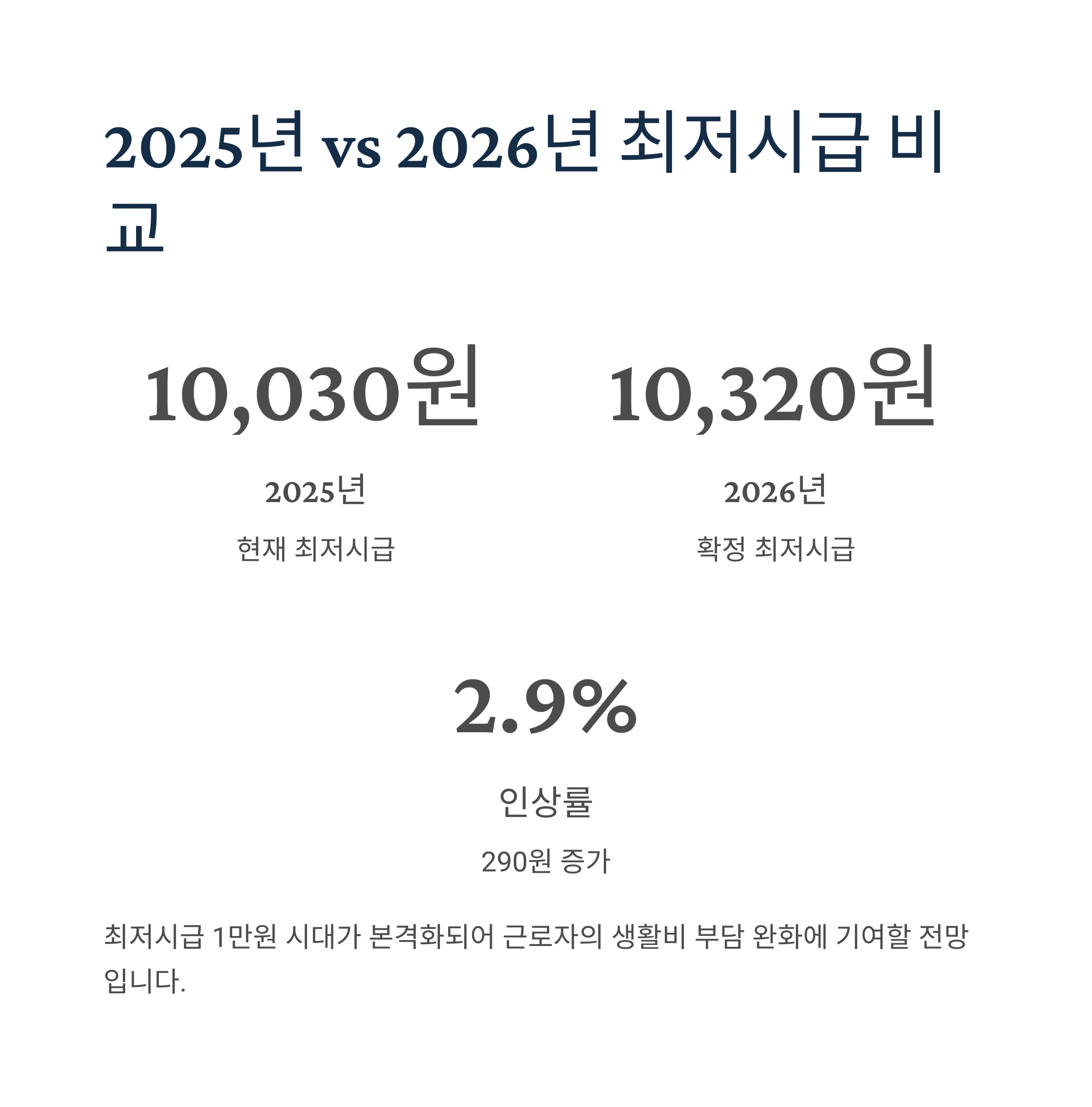 2026년 최저시급이 10320원으로 최종 확정되었습니다. 이는 2025년 최저시급 10030원 대비 290원(2.9%) 인상된 금액으로, 전국 알바생과 최저시급 근로자들의 실질 소득에 직접적인 영향을 미칠 예정입니다.