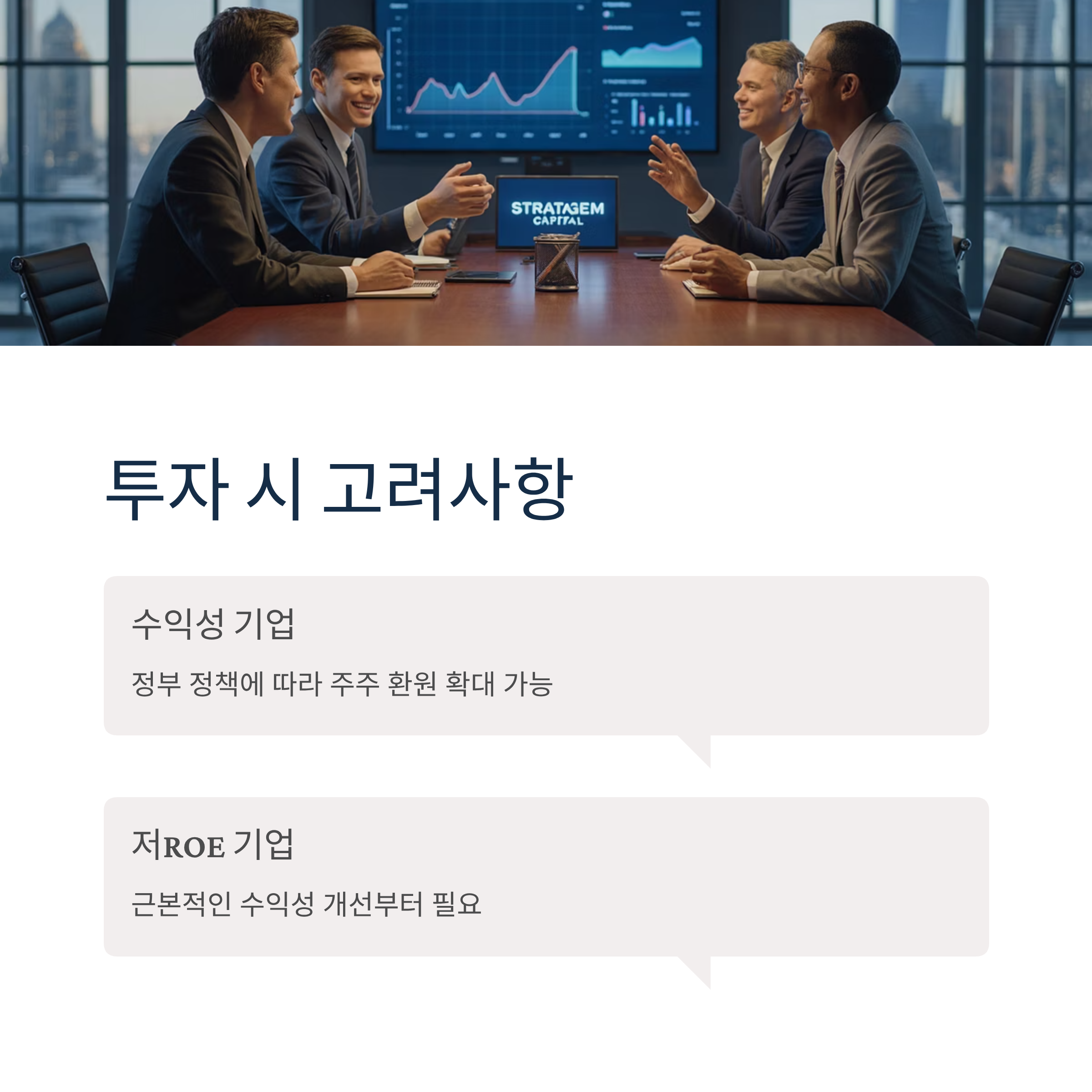 저 PBR주라고 해서 모두가 언제든 주가를 높일 수 있는 잠재력을 가진 기업일 수는 없습니다. 돈을 잘 버는 기업이라면 정부 정책 흐름에 따라 주주 환원을 확대하고 주가 저평가를 극복할 수 있겠지만, ROE가 낮은 기업들은 근본적으로 수익성을 높이는 것부터 시작해야 합니다.