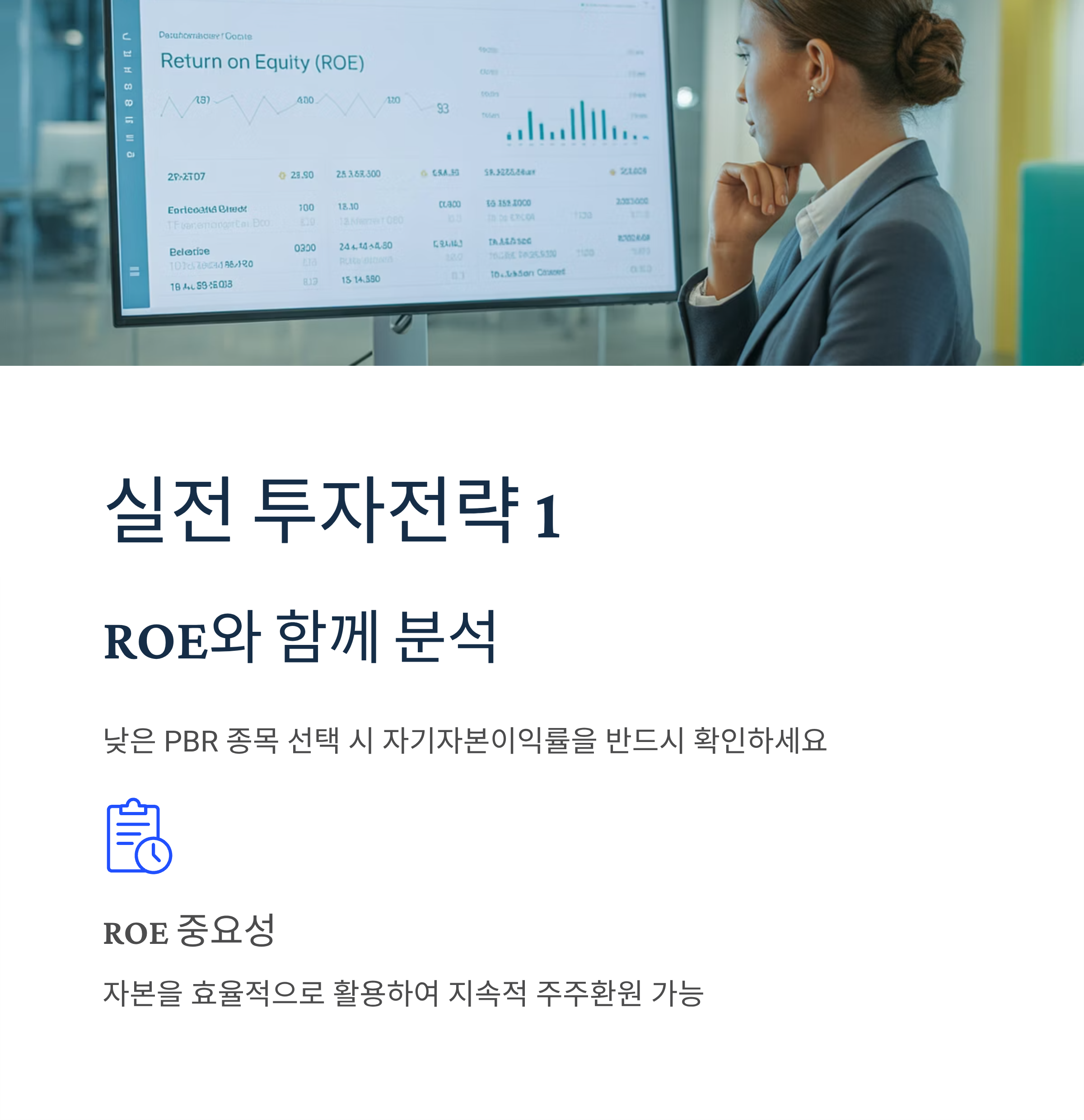 낮은 PBR 종목을 선택할 때는 반드시 ROE(자기자본이익률)를 함께 확인해야 합니다. ROE가 높은 기업은 자본을 효율적으로 활용하여 지속적인 주주환원이 가능합니다.