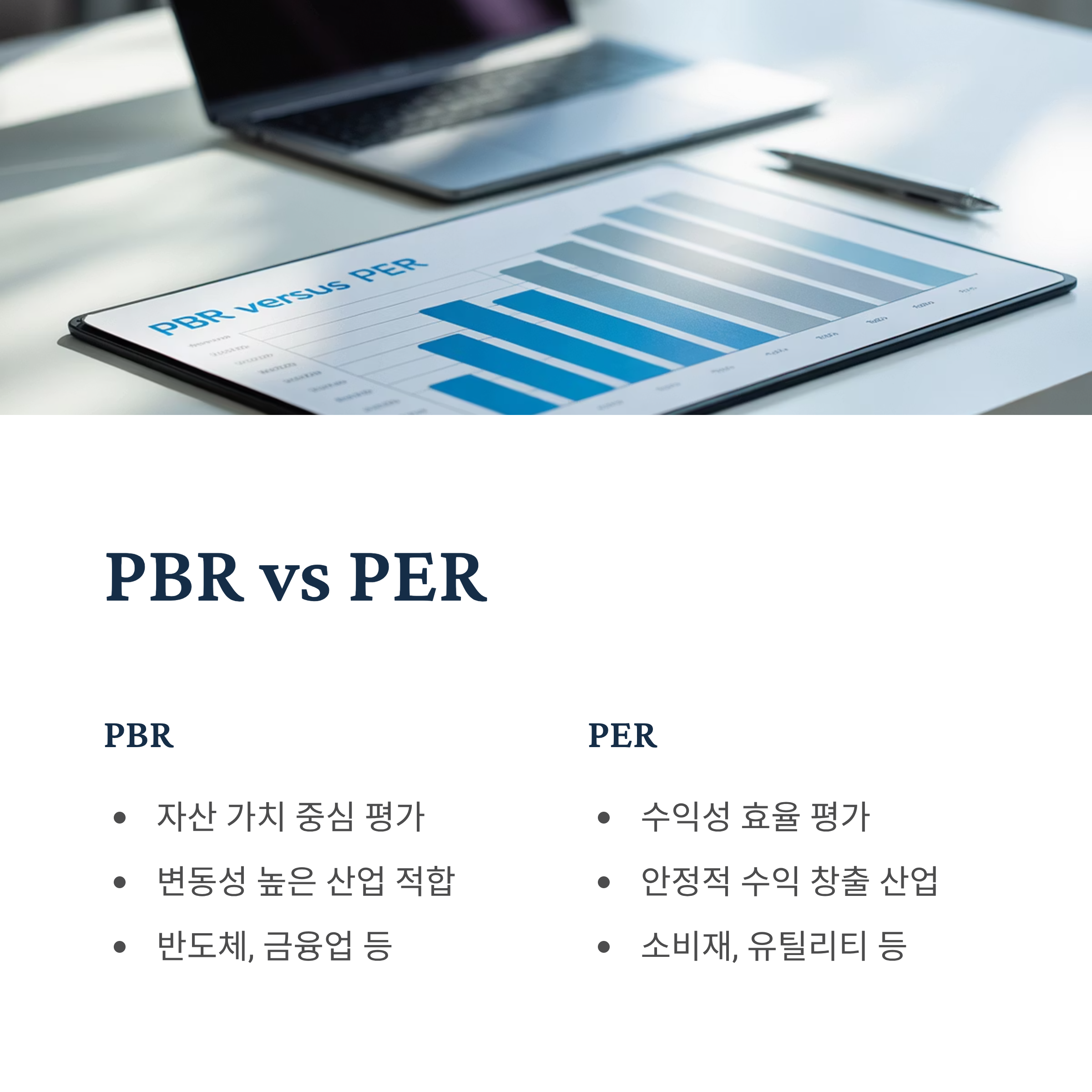 PBR은 기업이 가진 자산의 가치를 중심으로 평가하는 지표이고, PER은 기업이 이익을 얼마나 효율적으로 창출하는지를 평가하는 지표입니다.