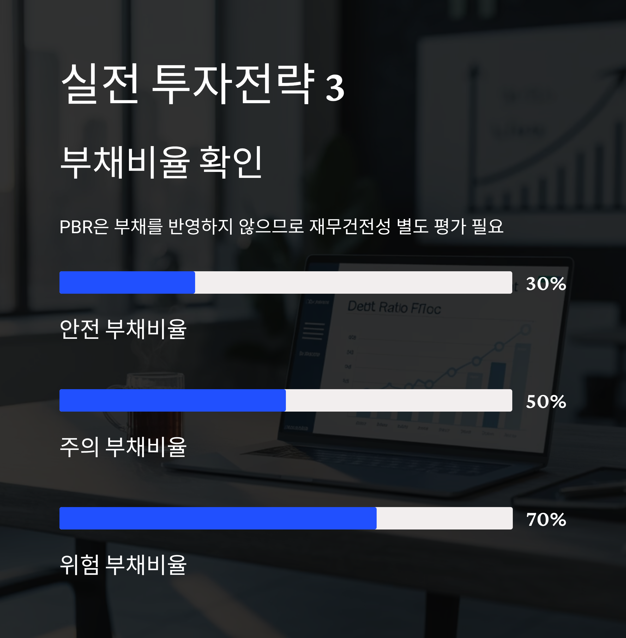 PBR은 부채를 반영하지 않으므로, 기업의 부채비율을 별도로 확인하여 재무건전성을 평가해야 합니다.