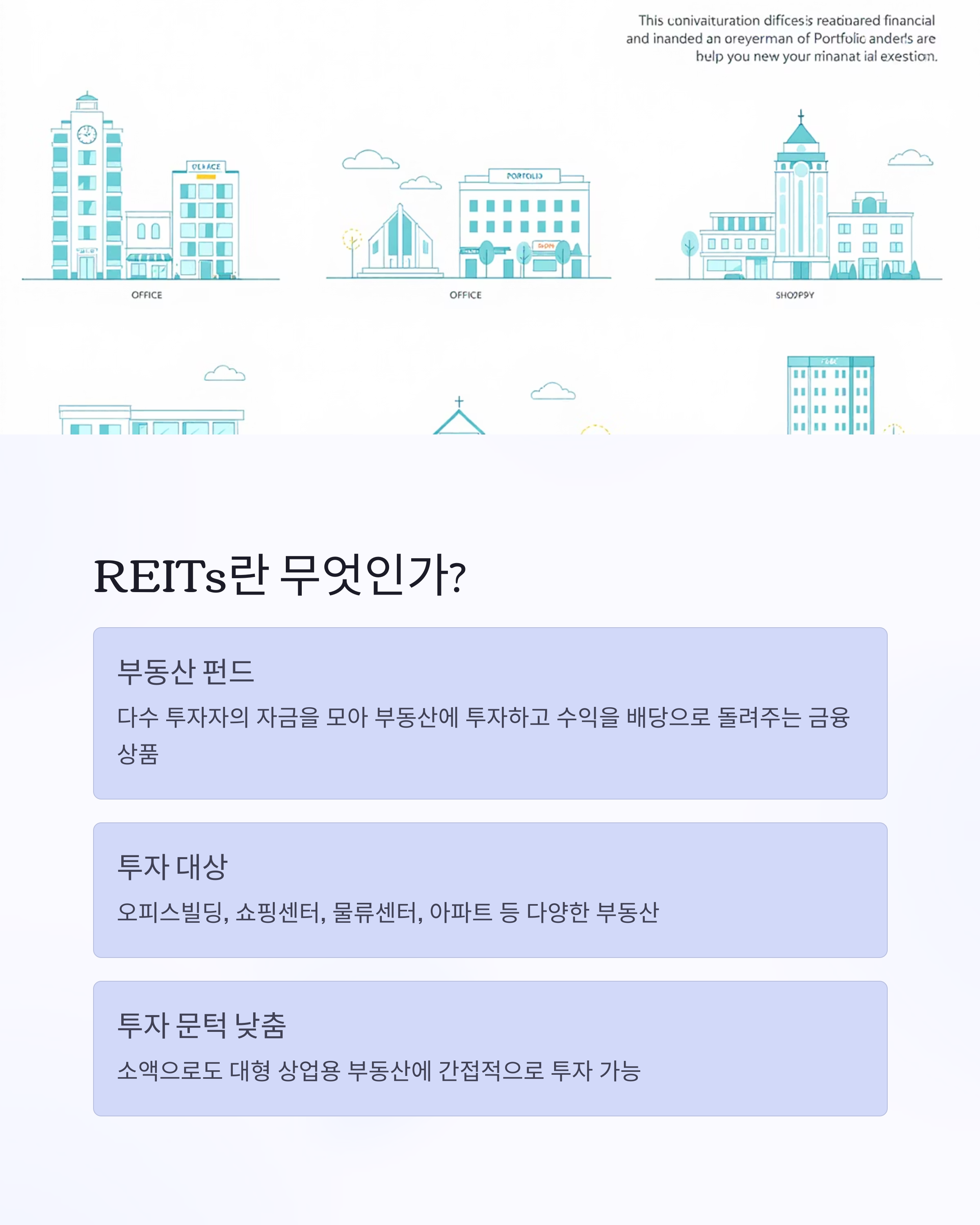 REITs(Real Estate Investment Trusts)는 부동산투자신탁을 의미하며, 다수의 투자자들로부터 자금을 모아 부동산에 투자하고 그 수익을 배당으로 돌려주는 금융상품입니다. 쉽게 말해 '부동산 펀드'라고 생각하면 됩니다.