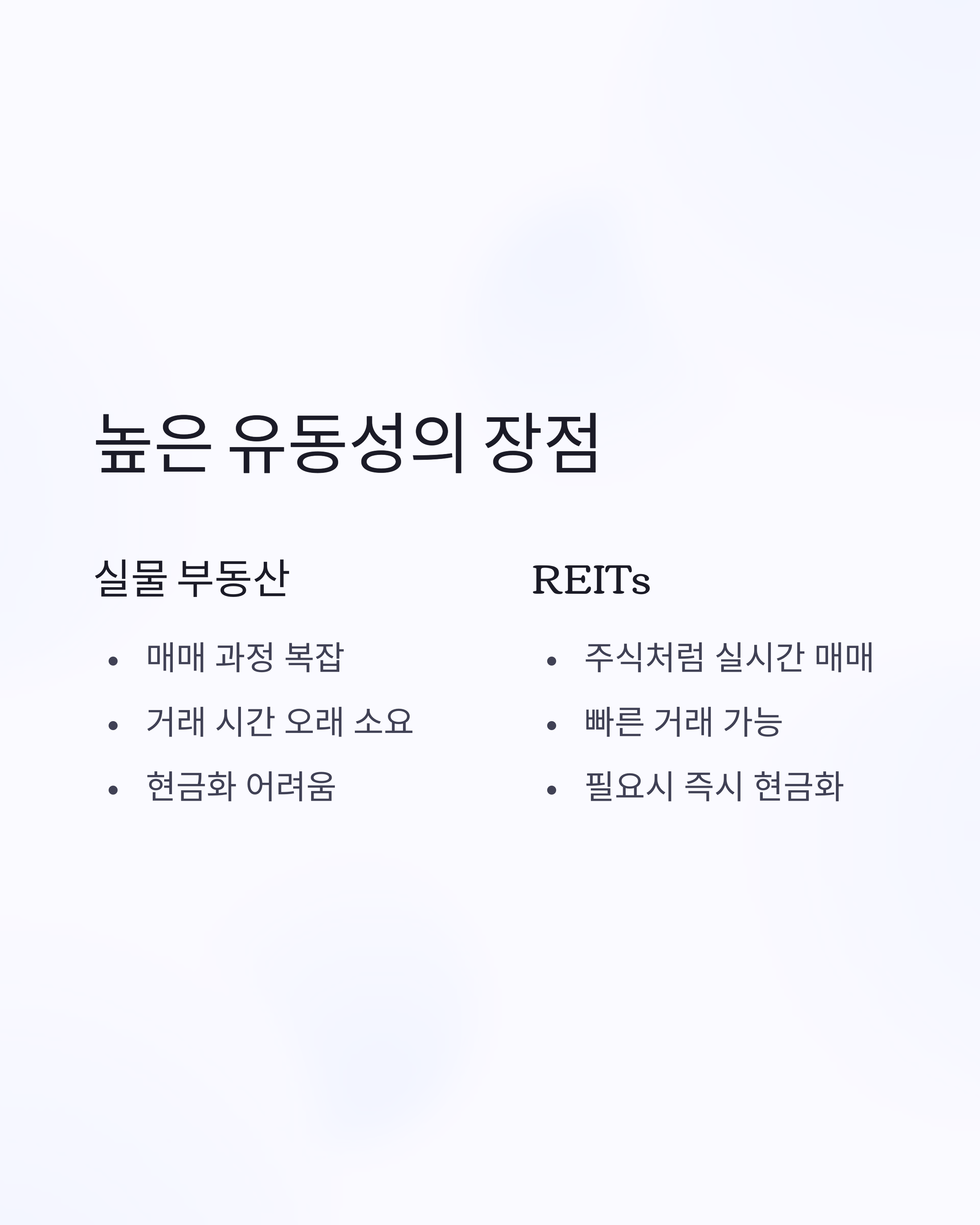 부동산 직접투자는 매매 과정이 복잡하고 시간이 오래 걸리지만, REITs는 주식처럼 거래소에서 실시간 매매가 가능합니다. 급한 자금이 필요할 때 빠른 현금화가 가능합니다.