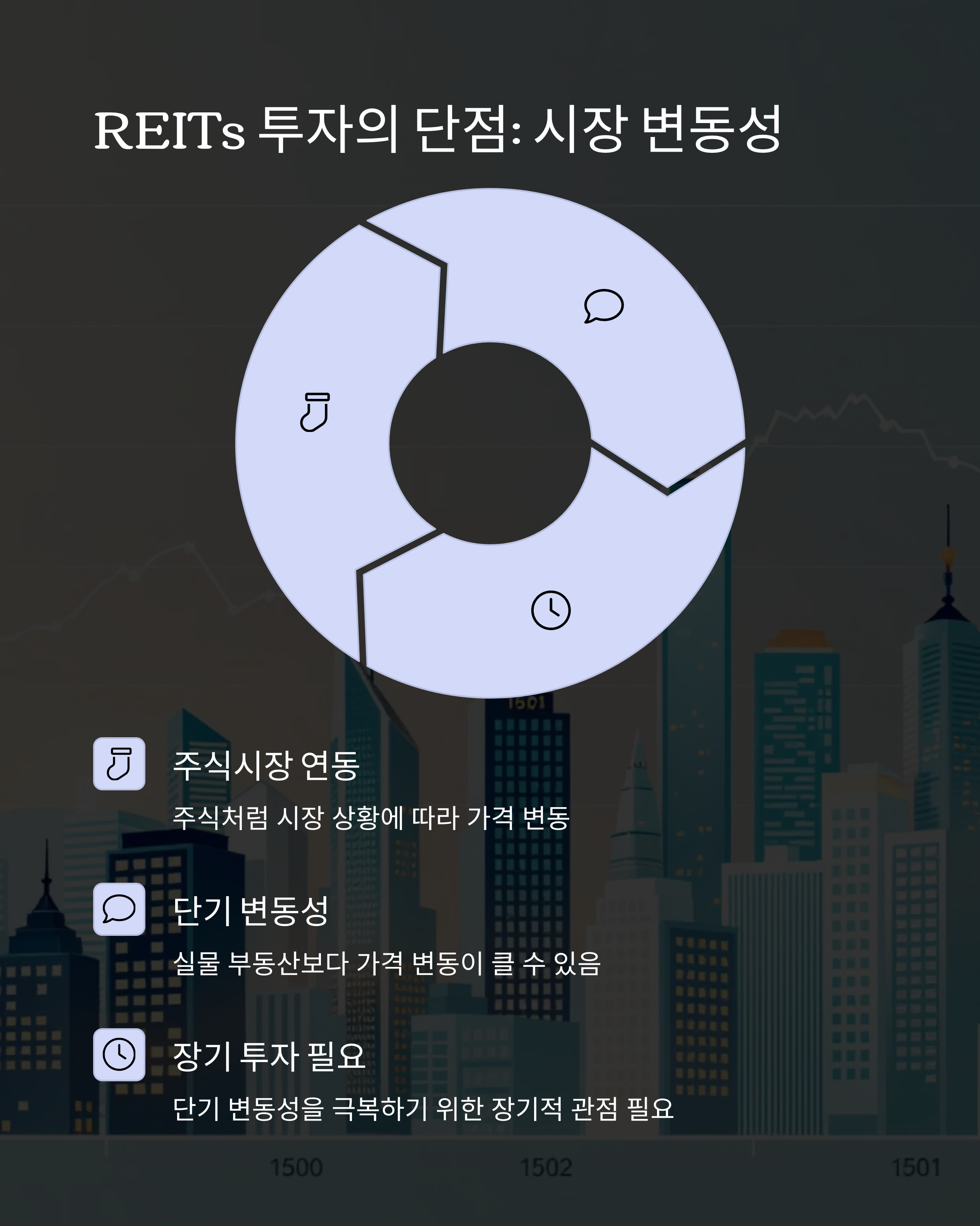 주식시장과 연동되어 있어 시장 상황에 따른 가격 변동이 있습니다. 실물 부동산보다 단기 변동성이 클 수 있어 장기 투자 관점이 필요합니다.