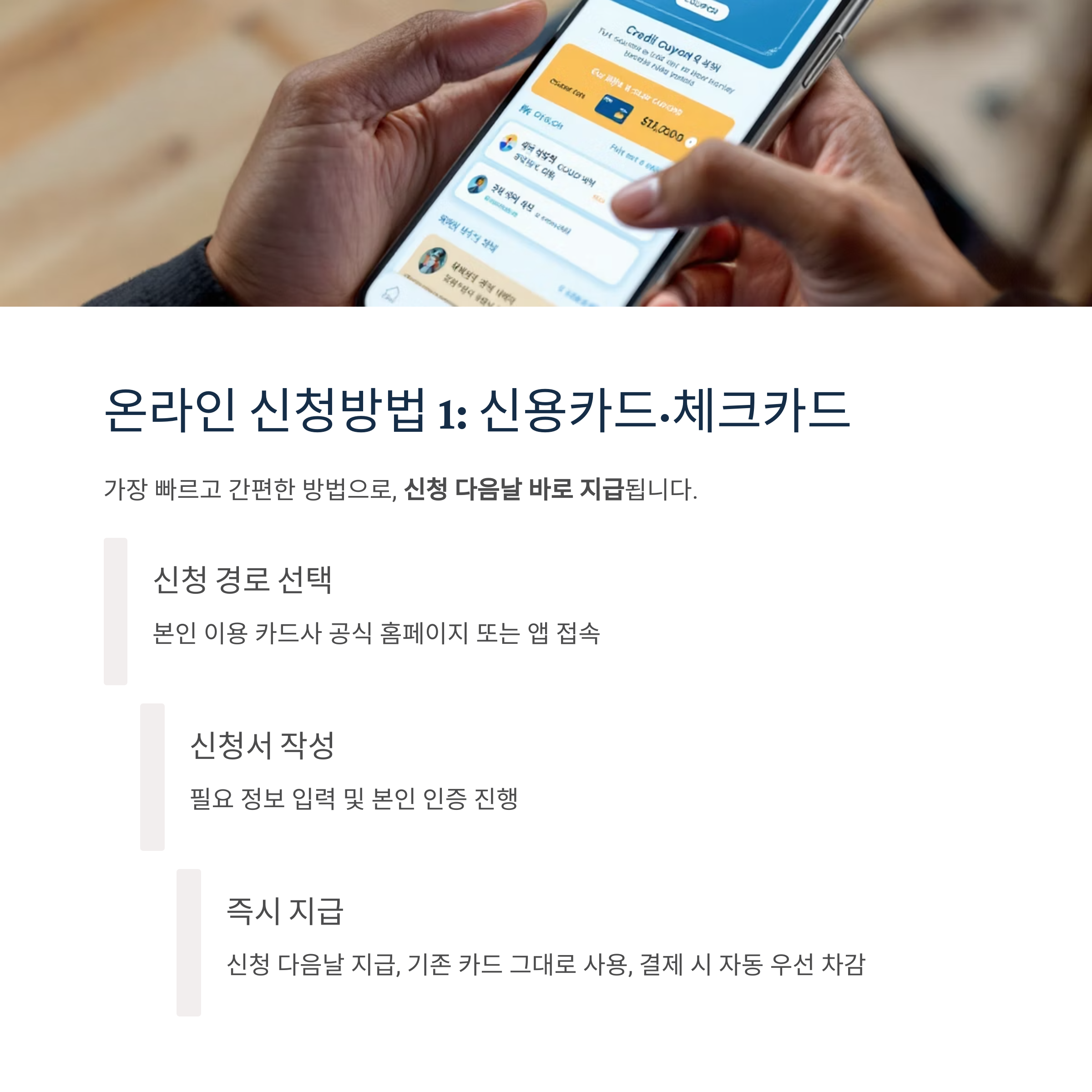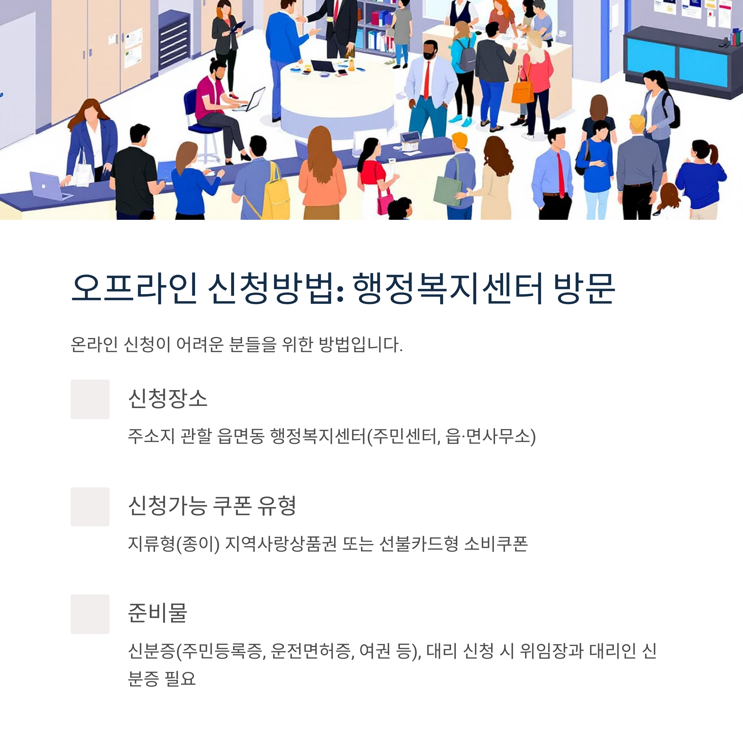 간편함과 속도를 원한다면 카드신청, 지역경제 기여와 동네 상권 이용이 많다면 지역사랑상품권을 선택하세요.